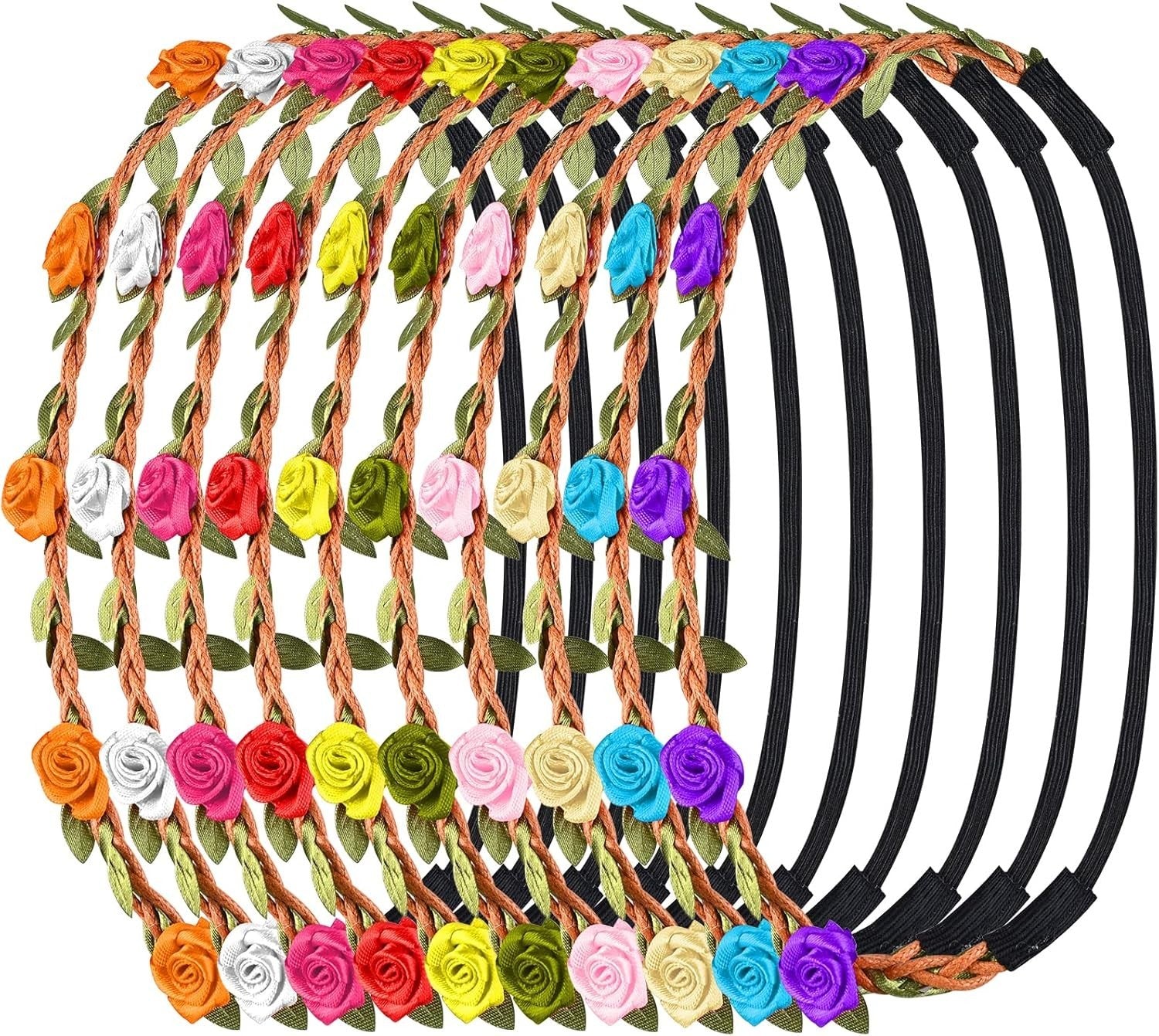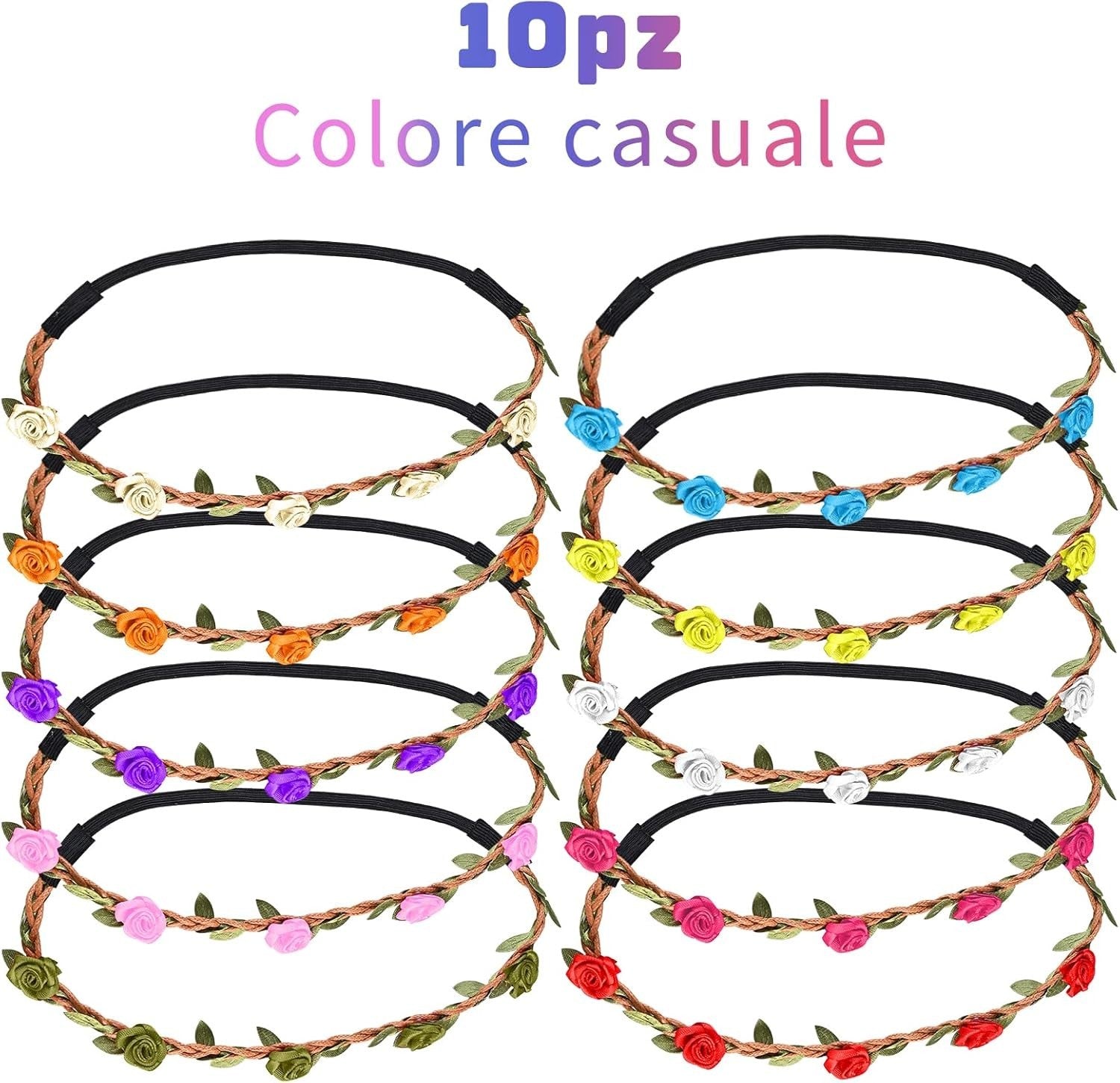 faburo 10 Stück mehrfarbige Blumenkronen-Stirnbänder, Girlande mit verstellbarem elastischem Band für Frauen, Mädchen oder Kinder für Festivals, Hochzeiten und Partys