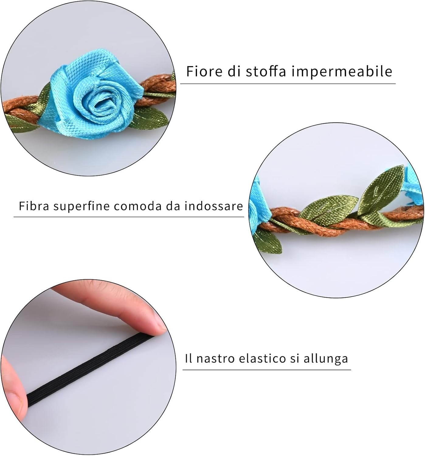 - MATERIAL: Kunstblumen bestehen aus Stoff (Blütenblätter) und Polyester (Blätter), Kunstleder (geflochtenes Band) und Spandex (Anpassung).
