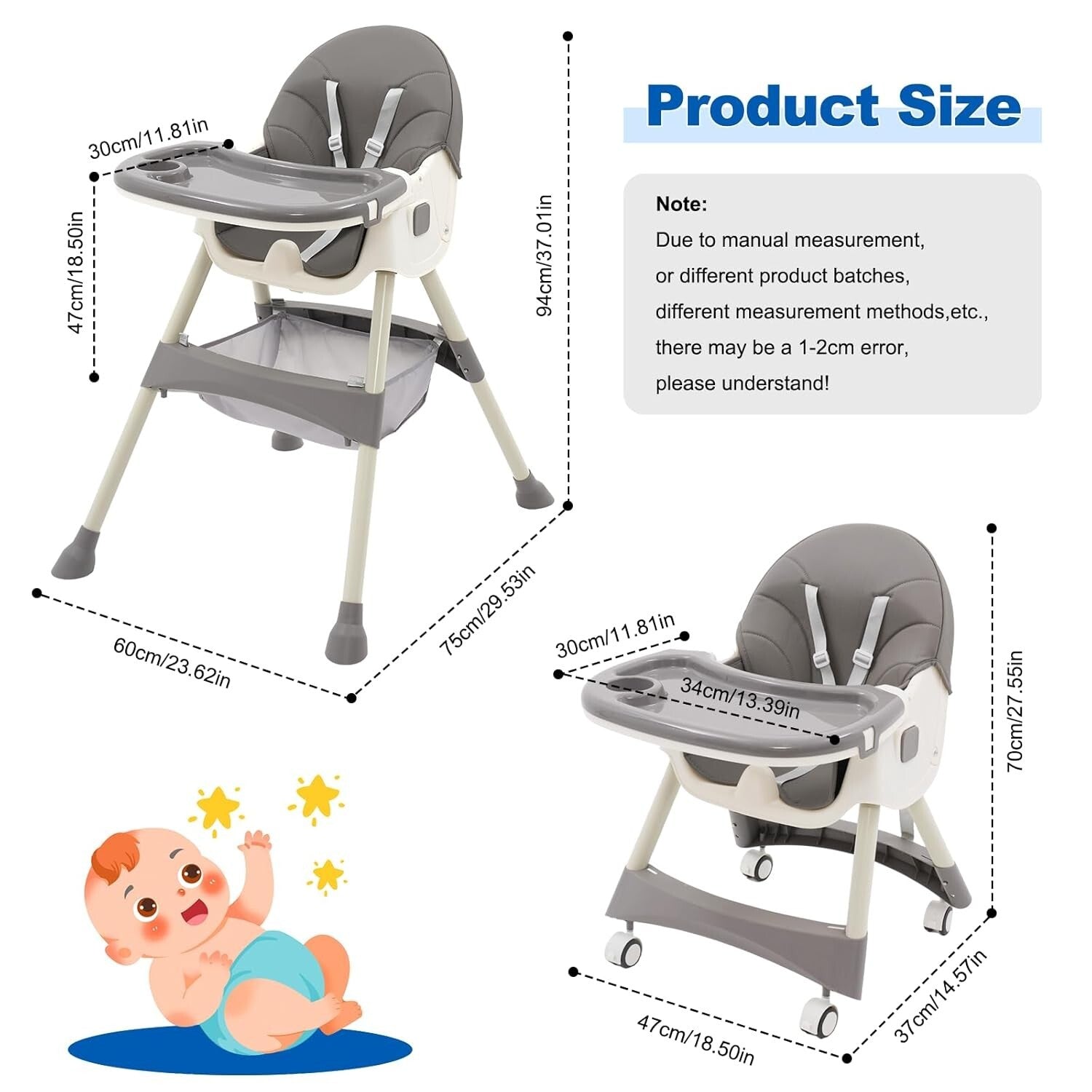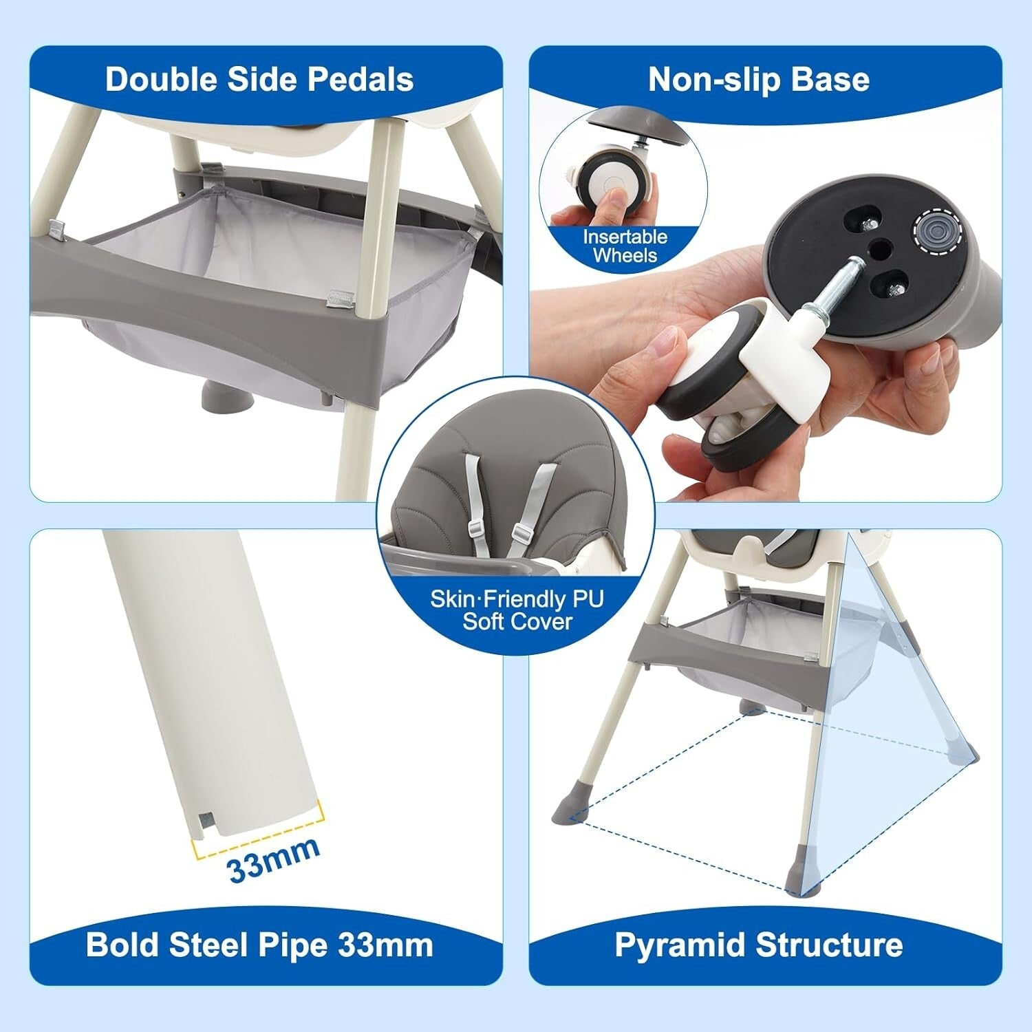 • 【Mehrfachsicherung】Pyramidenstruktur, Hufeisenfüße, drei Kombinationen feststellbarer Rollen zur Erhöhung der Stabilität, 5-Punkt-Sicherheitsgurt + rutschfester Gurt, damit das Baby nicht ausrutscht