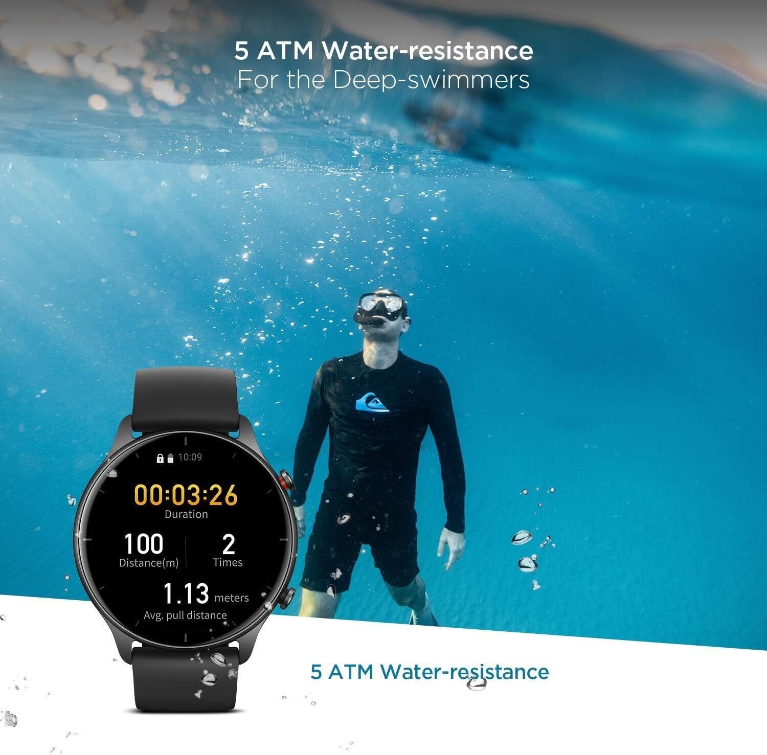 • 90 integrierte Sportmodi und 5 ATM wasserdicht: Aktivieren Sie einen der Sportmodi, und die Uhr wird einen entsprechenden Analysebericht in der mobilen App erstellen, nachdem Sie fertig sind, um Ihren Trainingsplan zu verbessern. Die intelligente Erkennung von Sportmodi eliminiert die Notwendigkeit, den Sportmodus manuell auszuwählen, und die Angabe 5 ATM bedeutet, dass Sie die Uhr während des Schwimmens verwenden können