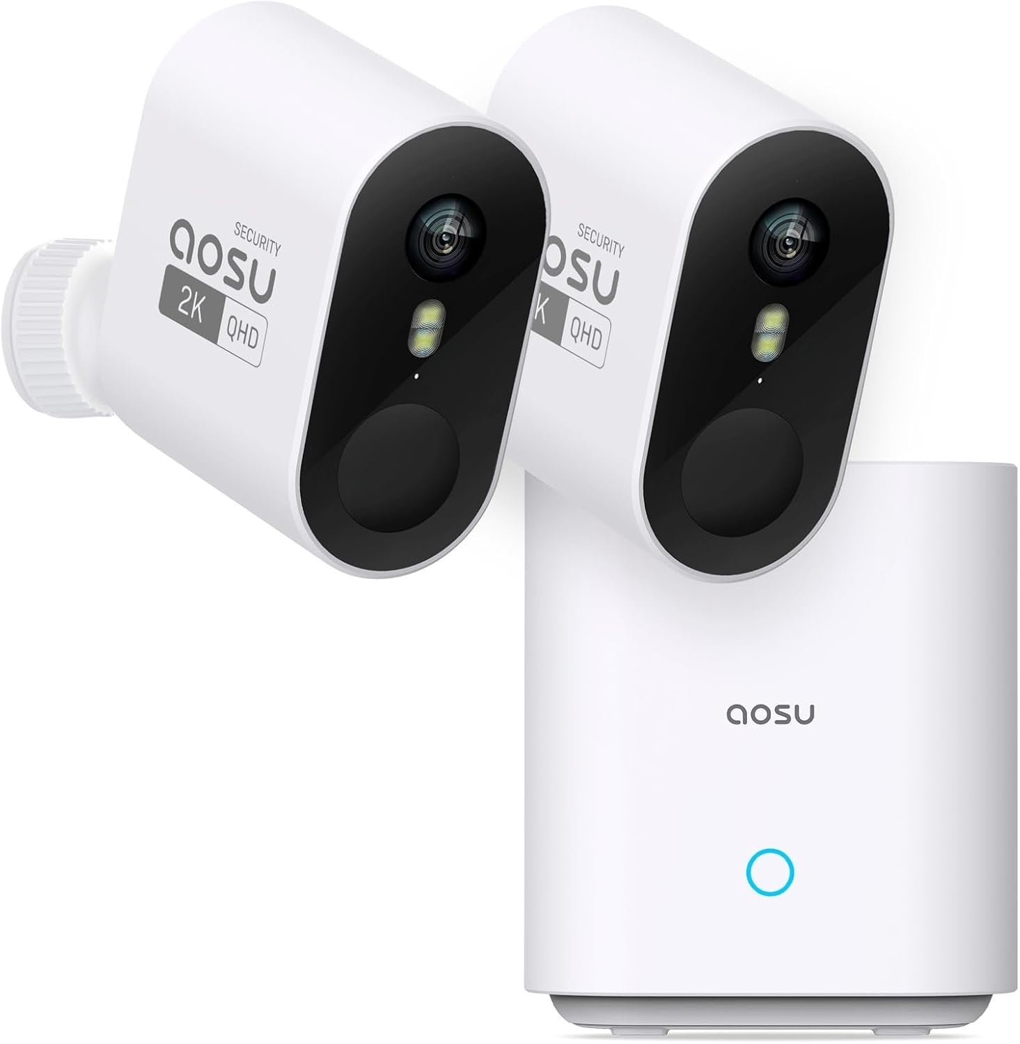 AOSU 2K Überwachungskamera Aussen Akku 240 Tage 2-Set mit HomeStation 32 GB Lokaler Speicher ohne ABO Kabellose Kamera Überwachug Aussen Bewegungssensor Licht- & Tonalarm 2-Wege-Audio Farb-Nachtsicht