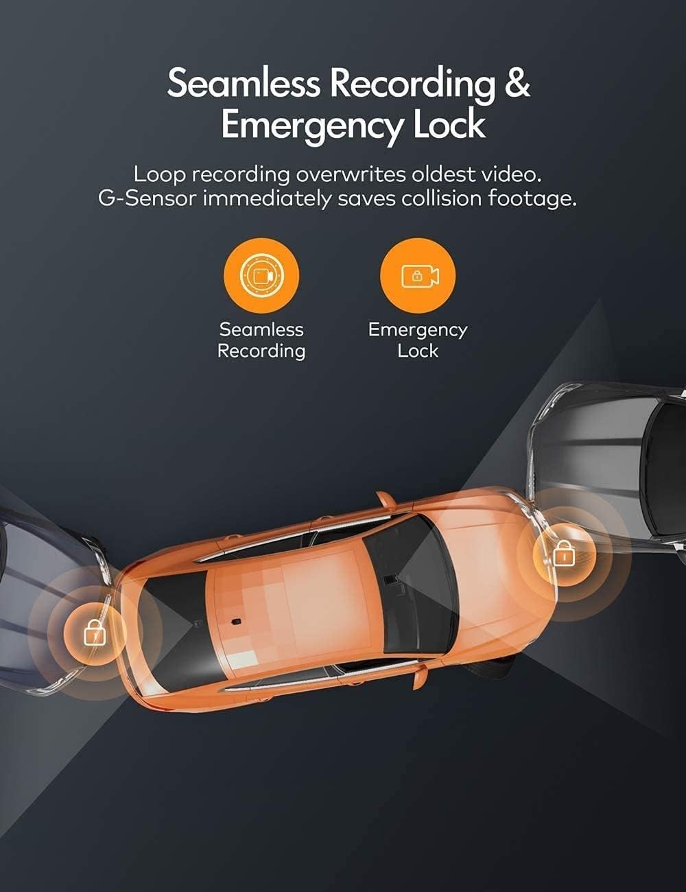 • Unfallerkennung: Dank des eingebauten G-Sensors speichert die Kamera die Aufnahmen automatisch im Falle einer Kollision oder einer Fahrt gegen Ihr Auto. Die Aufnahmen werden automatisch gespeichert und nicht überschrieben.