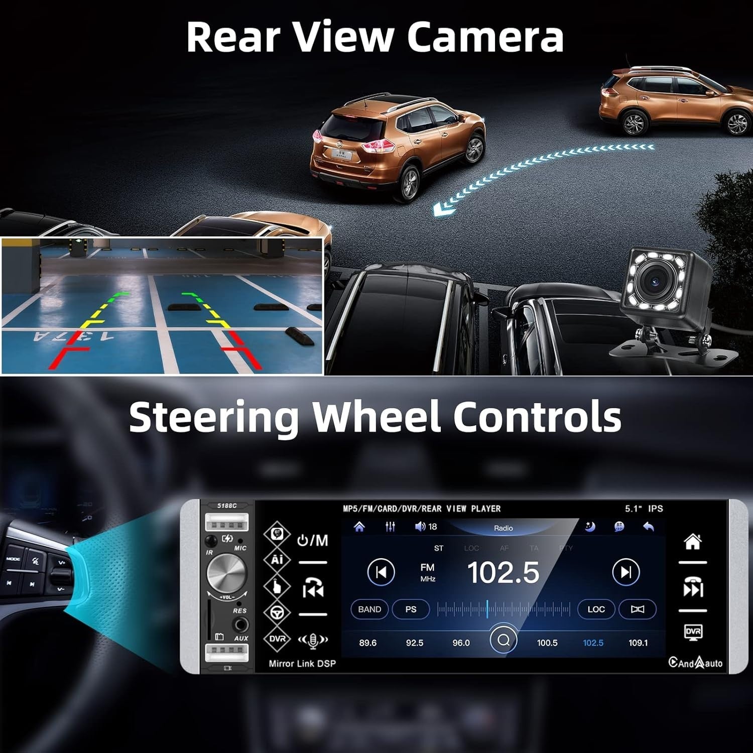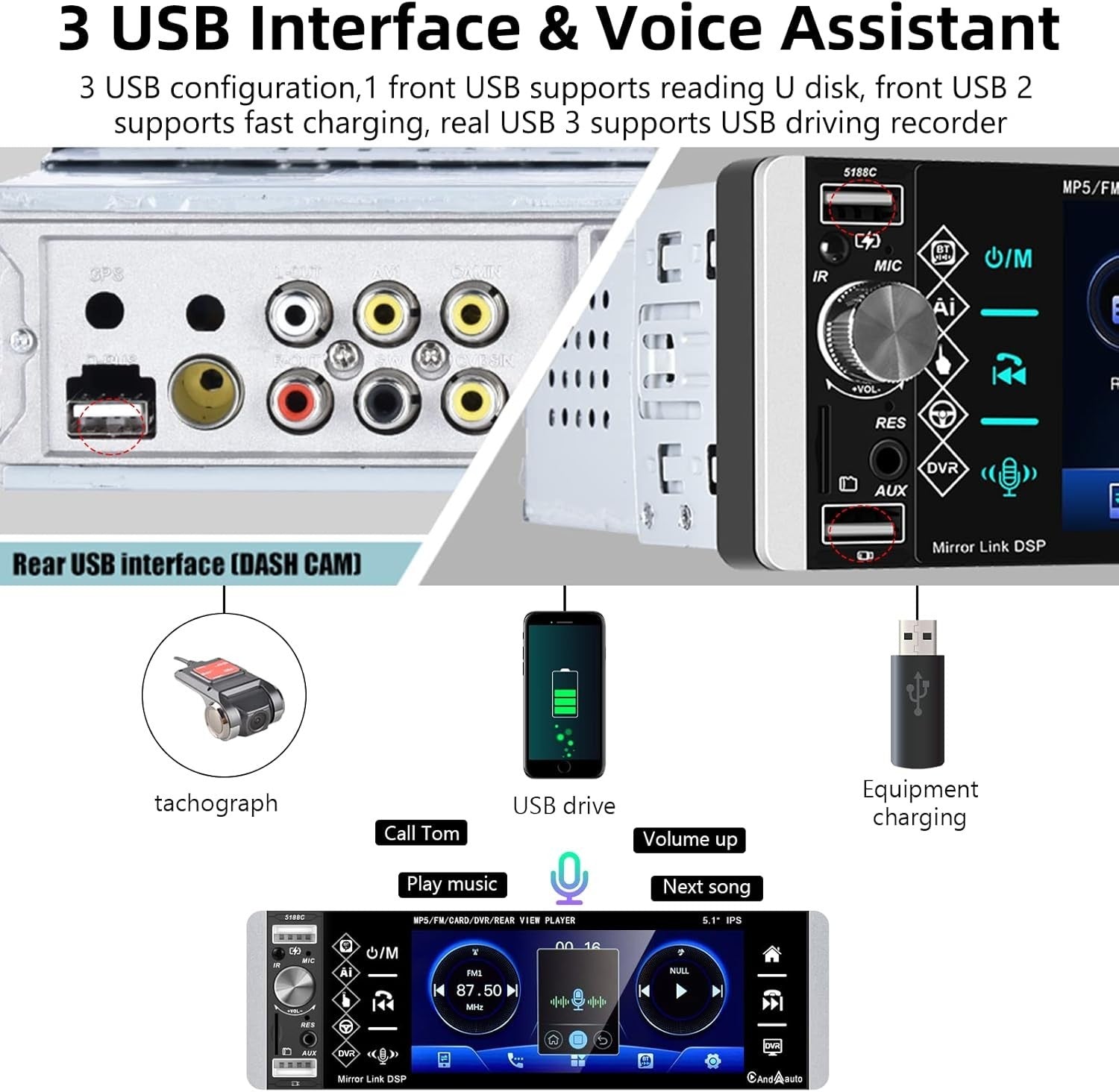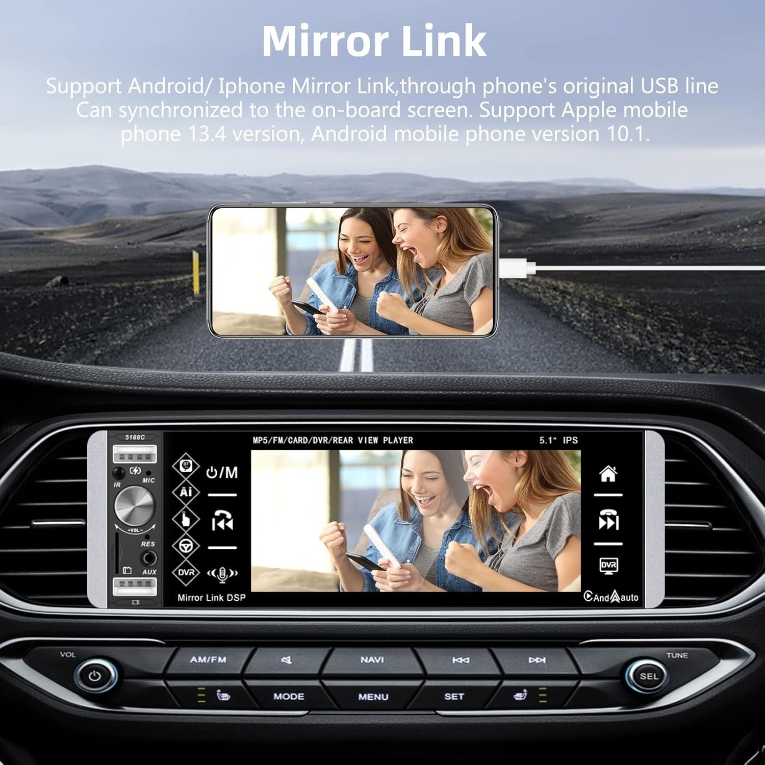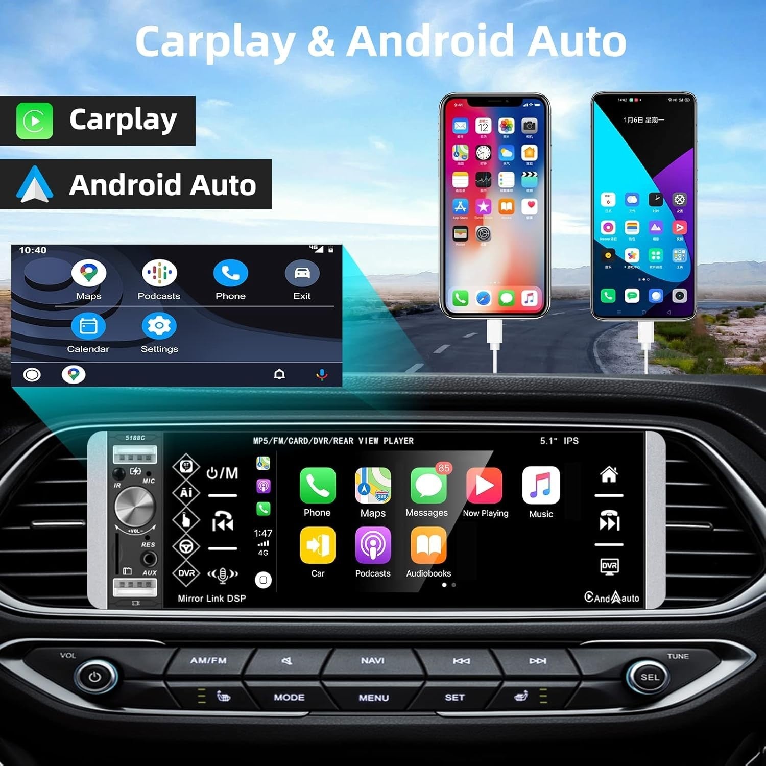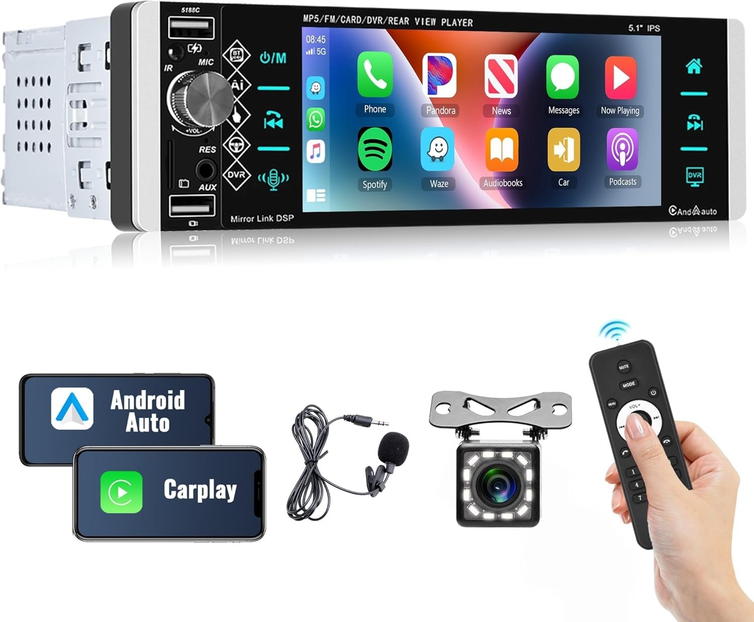 Autoradio 1 Din Apple Carplay Android Auto mit Bluetooth Freisprecheinrichtung 5.1 Zoll Bildschirm Touchscreen Digital Media Receiver mit Mirror Link Bluetooth FM/AM/3USB/AUX/TF/DSP/MIC - WIRD OHNE KABEL; RÜCKFAHRKAMERA ODER ÄHNLICHES GELIEFERT