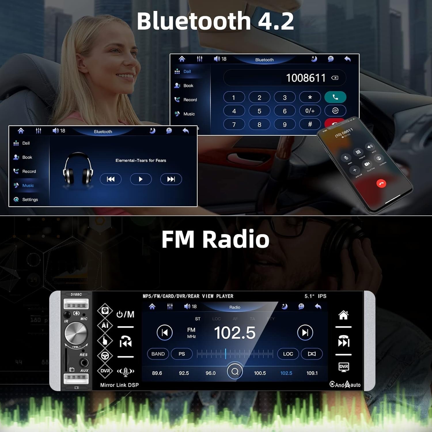 - 【Bluetooth 4.2 & FM Radio & Lenkradsteuerung】 1 Din Touchscreen Autoradio funktioniert mit Bluetooth, Freisprechen und Anrufen, intelligente Musikwiedergabe. Auto-Audioempfänger, unterstützt UKW-Radio, mit 18 voreingestellten Sendern können Sie Echtzeitverkehr, Nachrichtensendungen, Wettervorhersagen usw. hören. Unterstützen Sie die Lenkradsteuerungsfunktion, wechseln Sie schnell die gewünschten Funktionen mit dem Lenkrad Ihres Autos, bequemer.