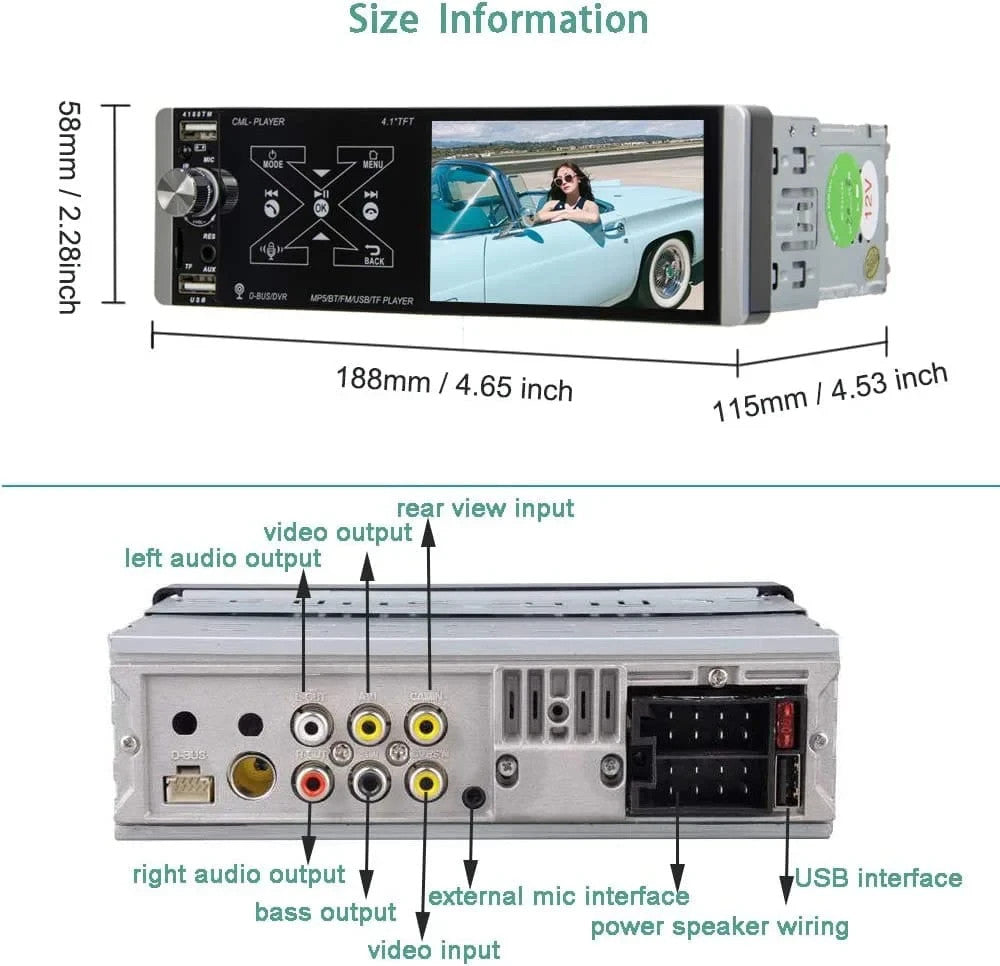- 【5.1 Zoll Touchscreen Autoradio 1 Din】Dies Autoradio 1 din Größe des Hauptbildschirms: 188 (B) * 58 (H) mm.Installationsgröße: 178 mm * 50 mm*118mm. 5.1 Zoll Voller Touchscreen Autoradio 1 din mit Fernbedienung, Mikrofon und Lenkradsteuerung. Unterstützt Taste Siebenfarbige Hintergrundbeleuchtung, Sie können Ihre Lieblingsfarbe im Setup-Menü auswählen und Ihr Auto dekorieren. Unterstützt USB, AUX , DVR. Unterstützung der USB Schnellladefunktion für Mobiltelefone und EQ Equalizer.