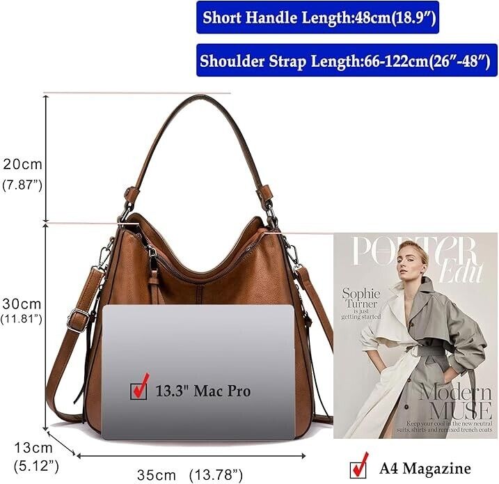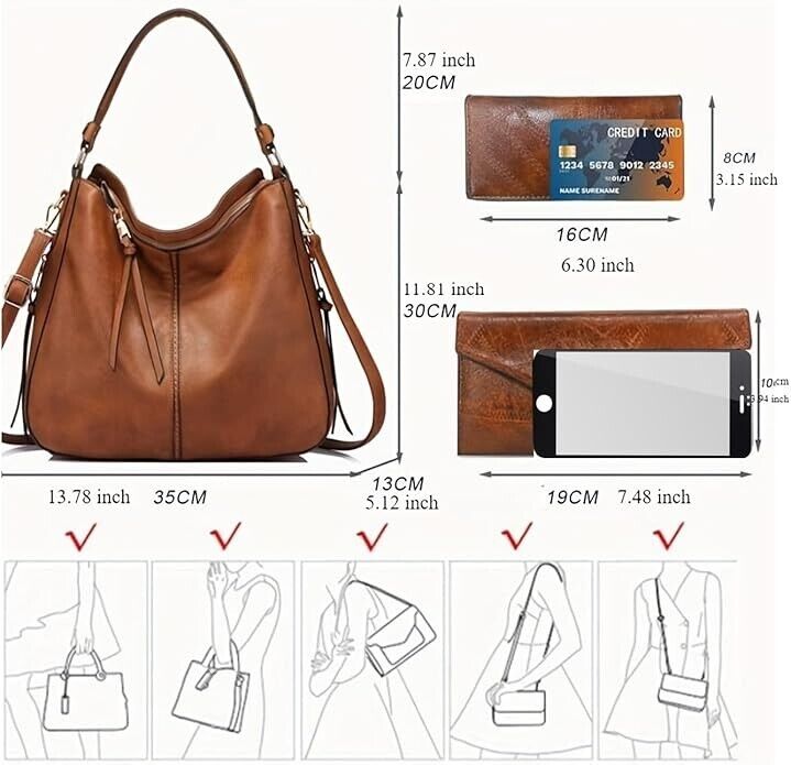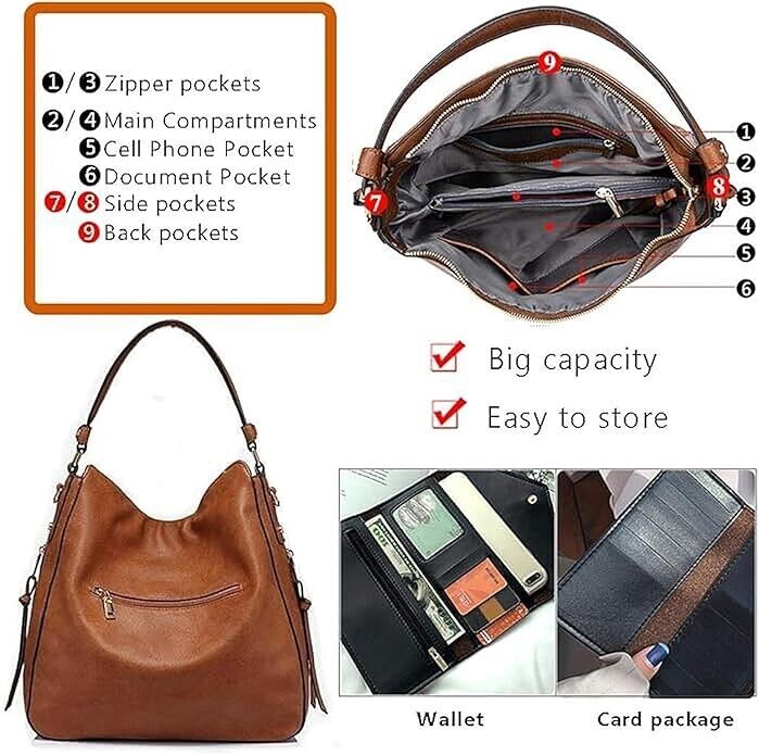 • 【Große Kapazität】: Damen Handtasche (13.4"*12"*5") , Brieftasche (7.5"*4" *0.4" ) , Kartentasche(6.3"*3"*0.4"). Die große Handtasche bietet Platz für brieftaschen, regenschirm, 13.3" Laptop , handys, kosmetik und vieles mehr portieren.