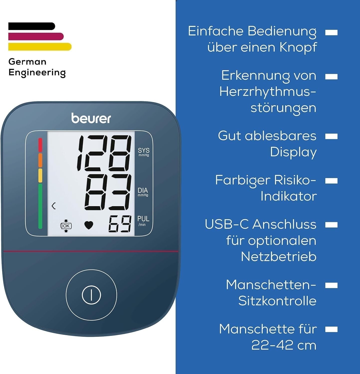 Beurer BM 25 Oberarm Blutdruckmessgerät, einfache Ein-Knopf-Bedienung, genaue Messung, Arrhythmie-Erkennung, mit USB-C-Anschluss, Manschette für 22-42 cm, Datenübertragung zu Apple Health und co.