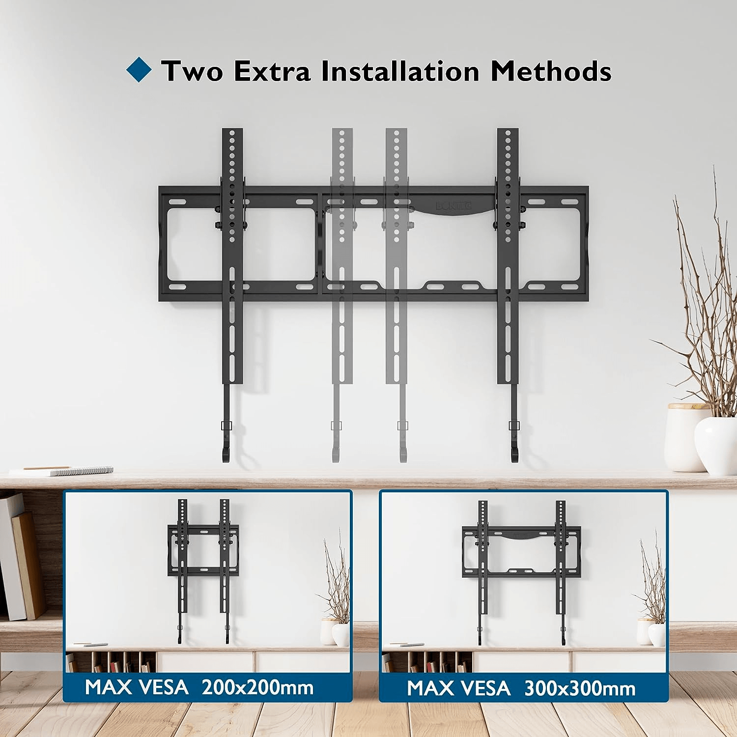 Die BONTEC TV Wandhalterung ist flach, was bedeutet, dass sie nicht zu stark aus der Wand herausragt und nicht viel Platz in Ihrem Raum beansprucht. Nach der Installation beträgt der Abstand zwischen Wand und Fernseher nur 30 mm. Das Besondere an dieser TV-Halterung ist, dass sie für drei TV-Größen verwendet werden kann. Es ist hauptsächlich für größere Fernseher von 37-86 Zoll gedacht. Sie können es auch in zwei kleinere TV Halterungen zerlegen: Die kleinere ist für 17-45-Zoll-Fernseher mit einer maximalen VESA von 200 x 200 mm und die größere für 23-55-Zoll-Fernseher mit einer maximalen VESA von 400 x 400 mm.
