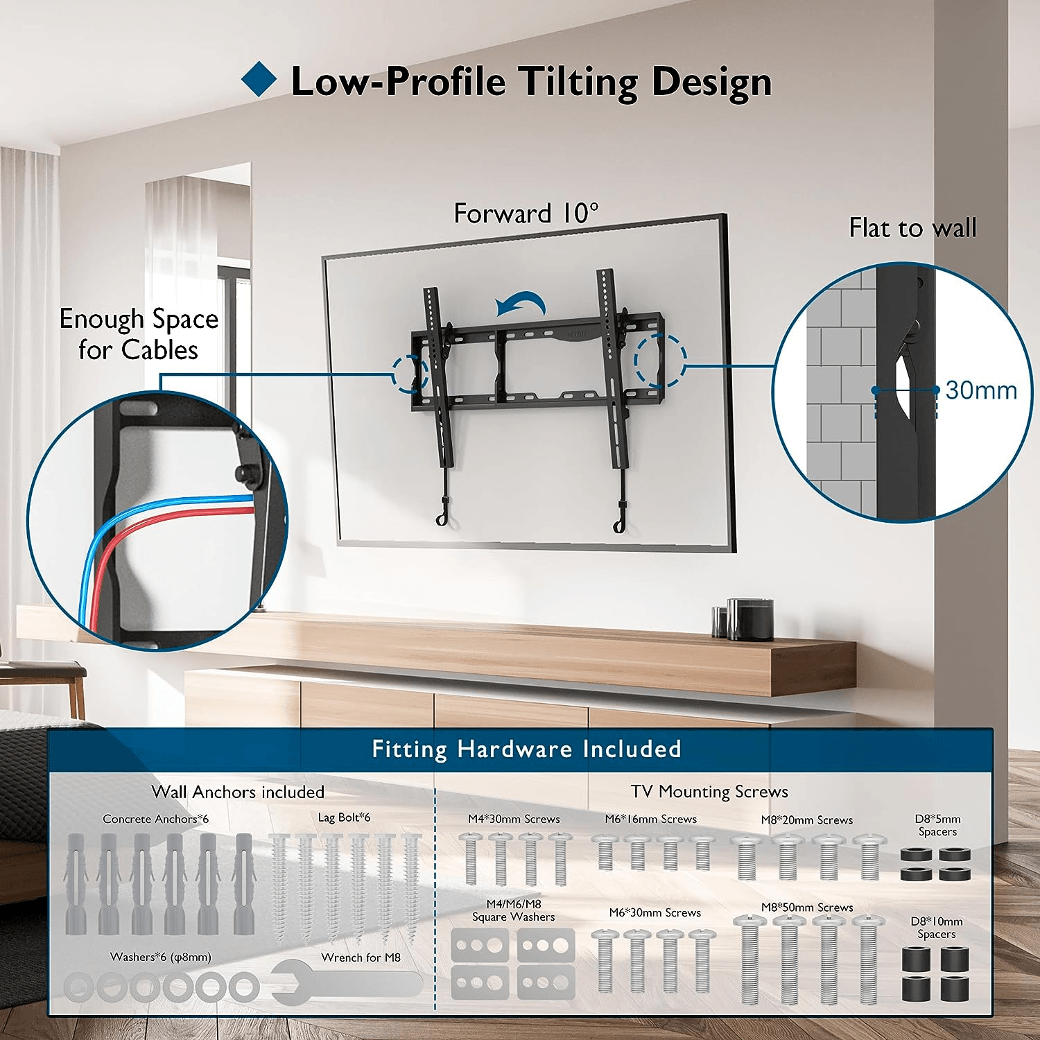 • Verbessern Sie Ihr Seherlebnis: Unsere flache TV Halterung ragt nur 3 cm von der Wand weg, um Platz in Ihrem Wohnzimmer oder Schlafzimmer mit einem stilvollen Erscheinungsbild zu sparen. Diese TV-Wandhalterung verfügt außerdem über eine Neigungsfunktion, mit der Sie um 10 ° nach unten kippen können, um das beste Seherlebnis zu erzielen und die Gesundheit zu verbessern, um Blendung und Belastung von Hals und Augen zu reduzieren