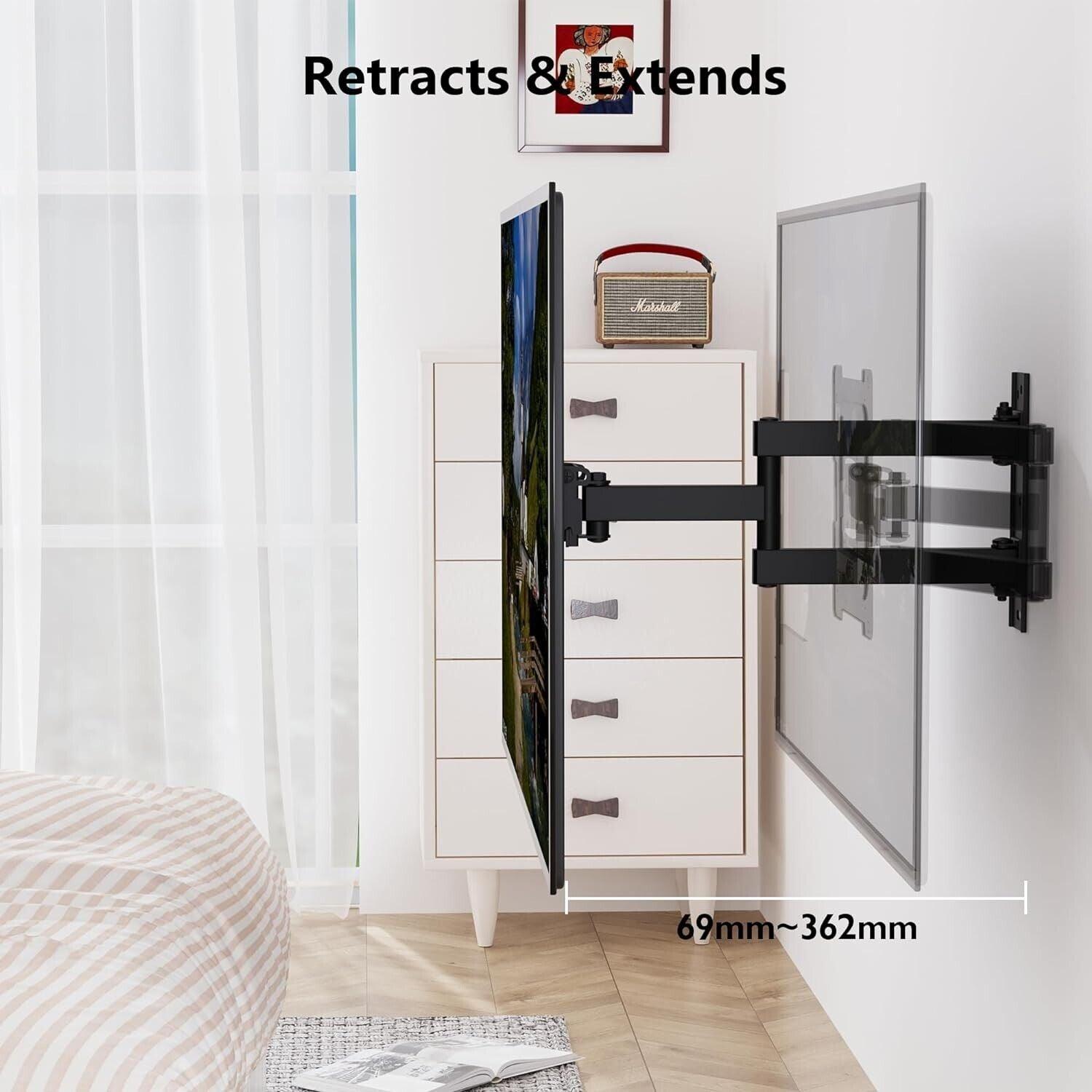 • Ausziehbar und einziehbar: Die verlängerte Gelenk-TV-Wandhalterung ist mit voll beweglichen Gelenkarmen ausgestattet, die sich platzsparend und leicht 50 mm von der Wand zurückziehen lassen und zur Verbesserung der Flexibilität bis zu 400 mm ausfahren können.