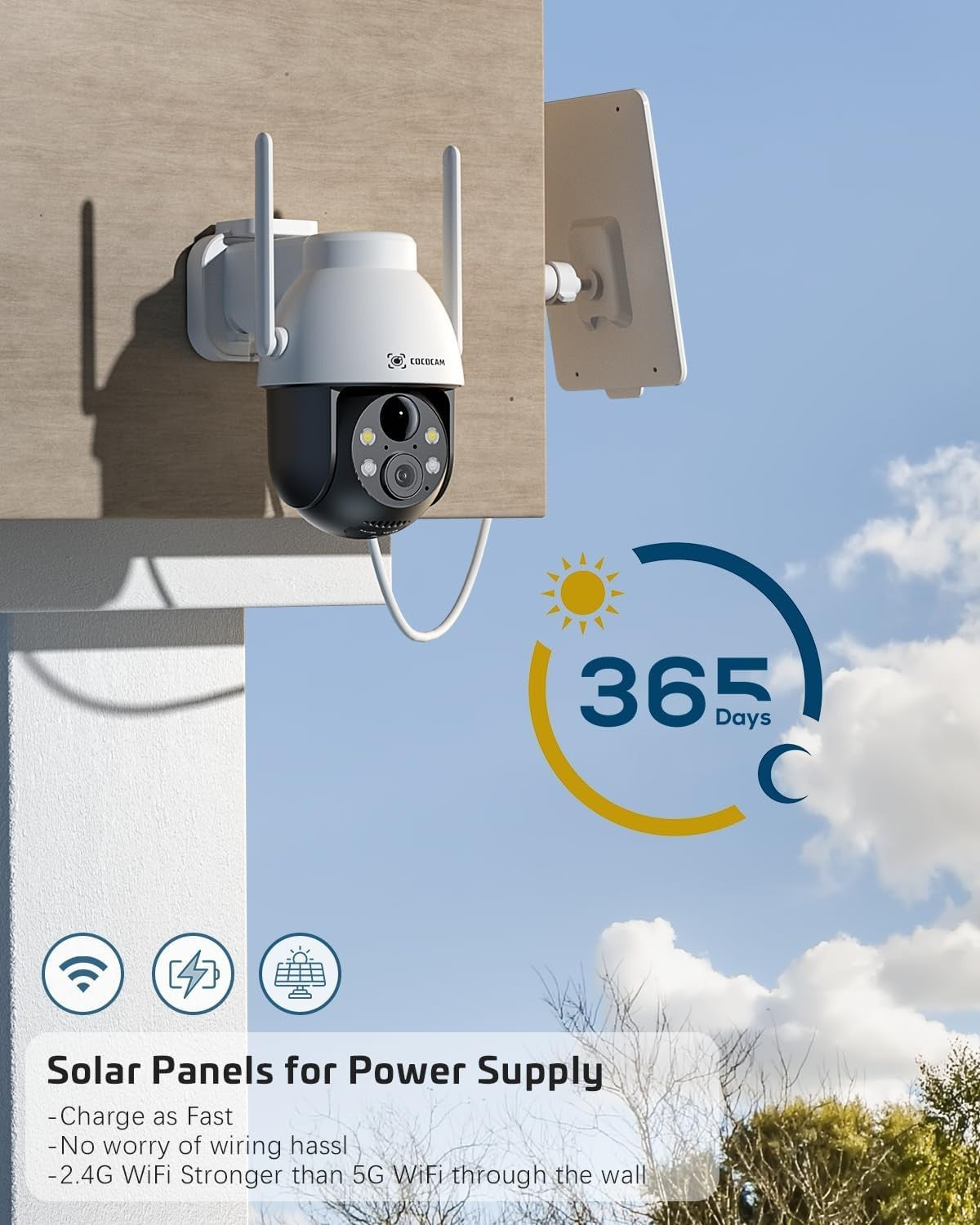 - Solar Powered & 100% Wire-Free -- Die drahtlose Sicherheitskamera für den Außenbereich mit Solarpanel und 5200mAh-Akkus sorgt für ewige Energie. Sie müssen die Kamera zum Aufladen nicht abnehmen. 4dbi Dual-Antennen berechtigen die Kamera eine stärkere und stabilere Netzwerk-Empfang.(Nur unterstützt 2.4Ghz WiFi, die eine bessere Durchdringung und breitere WiFi-Reichweite hat, nicht 5GHz.)