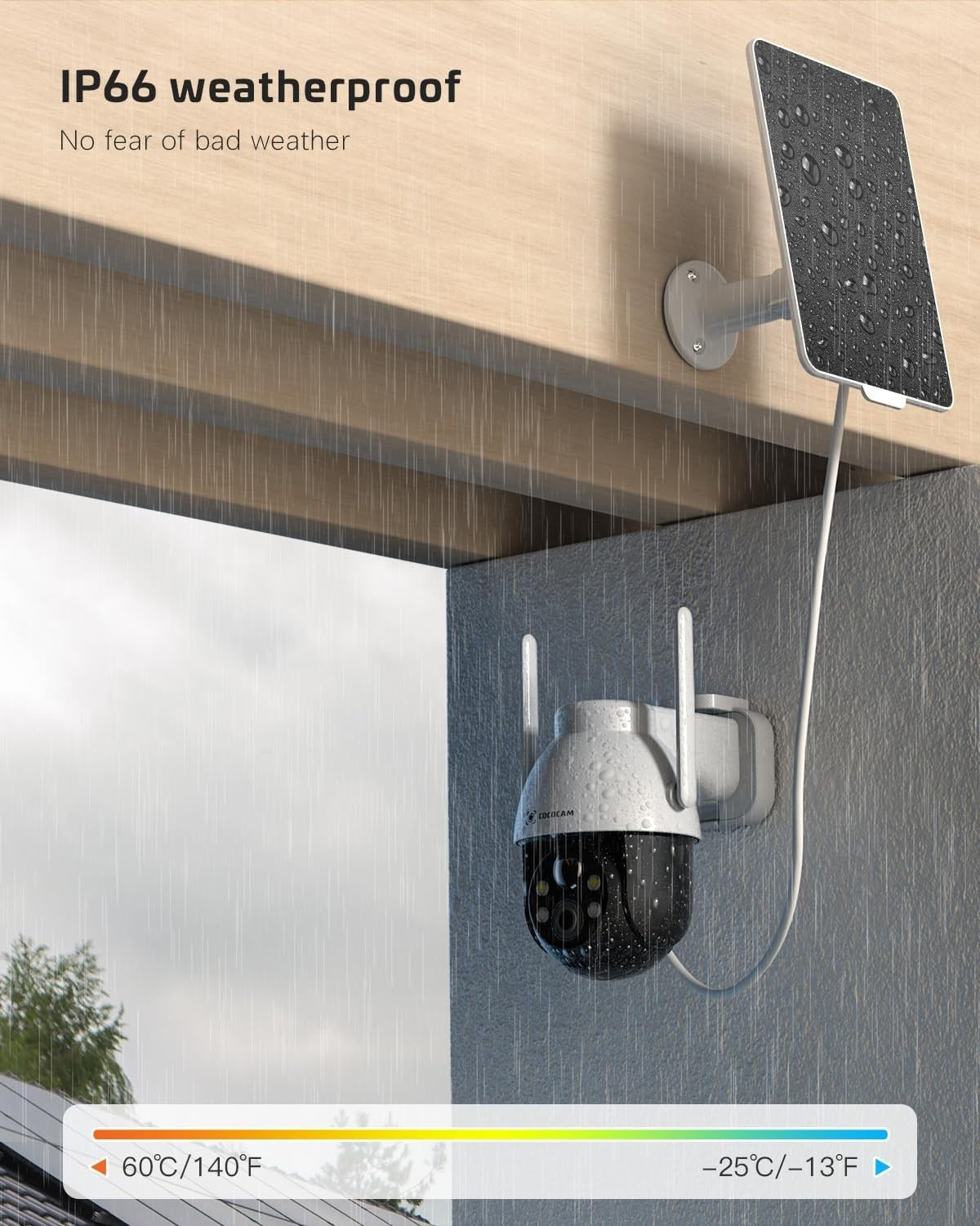 - IP66 Weatherproof & Easy to Install -- COCOCAM Solar-Sicherheitskamera für den Außenbereich, die kristallklare Bilder und Videos unabhängig von den Wetterbedingungen liefert.die Standard-Betriebstemperatur sollte von -13°F bis 140°F (-25°C bis 60°) sein. Sie benötigen nur zwei Schrauben für die Kamera und drei für die Solarpanel-Halterung (alle im Lieferumfang enthalten), nur 10 Minuten, können Sie die Installation abzuschließen.