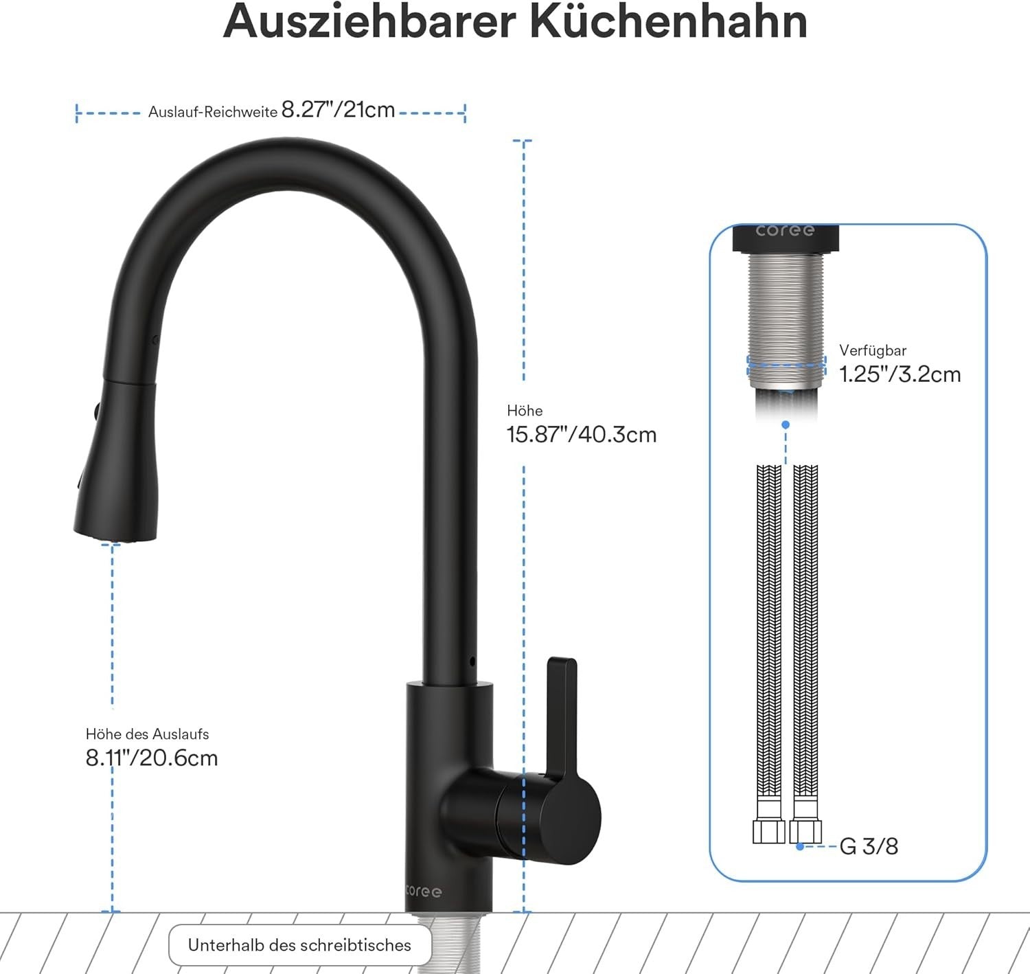 • Passende Größe für Ihre Küche: Die COREE Küchenarmatur ist 37,4 cm hoch, mit einer Auslaufhöhe von 16,3 cm, einem Düsenbereich von 21,1 cm und einer Duschkopflänge von 60 cm. Überprüfen Sie vor dem Kauf die Kompatibilität mit Ihrer Küche. Bei Fragen stehen wir Ihnen gerne zur Verfügung