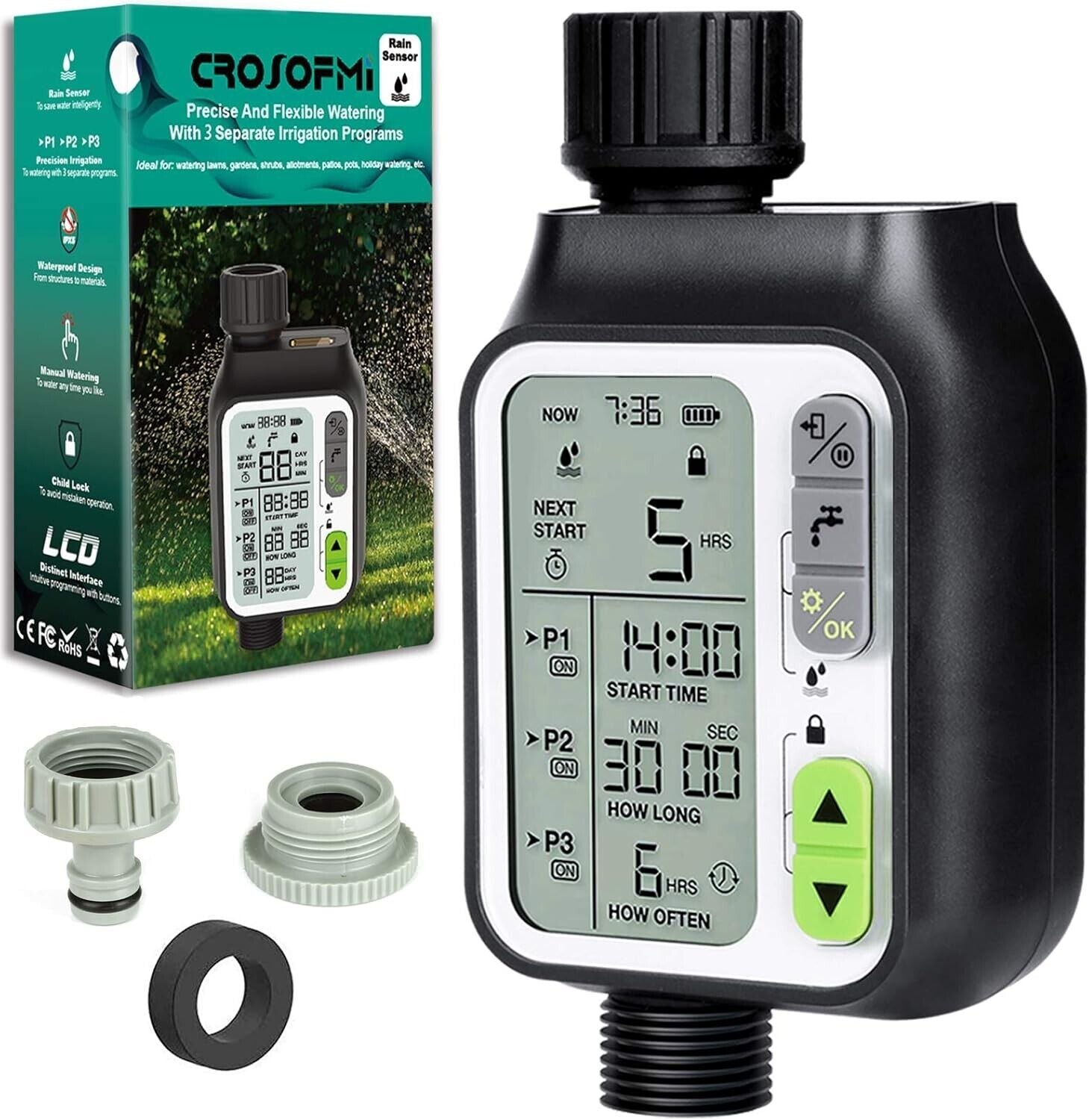 CROSOFMI Bewässerungscomputer Automatische Garten Bewässerungssystem Smart Control Gartenbewässerung Bewässerungsuhr, Regensensor wasserdichte Manuelle Steuerung und 3 Separate Bewässerungsprogramme