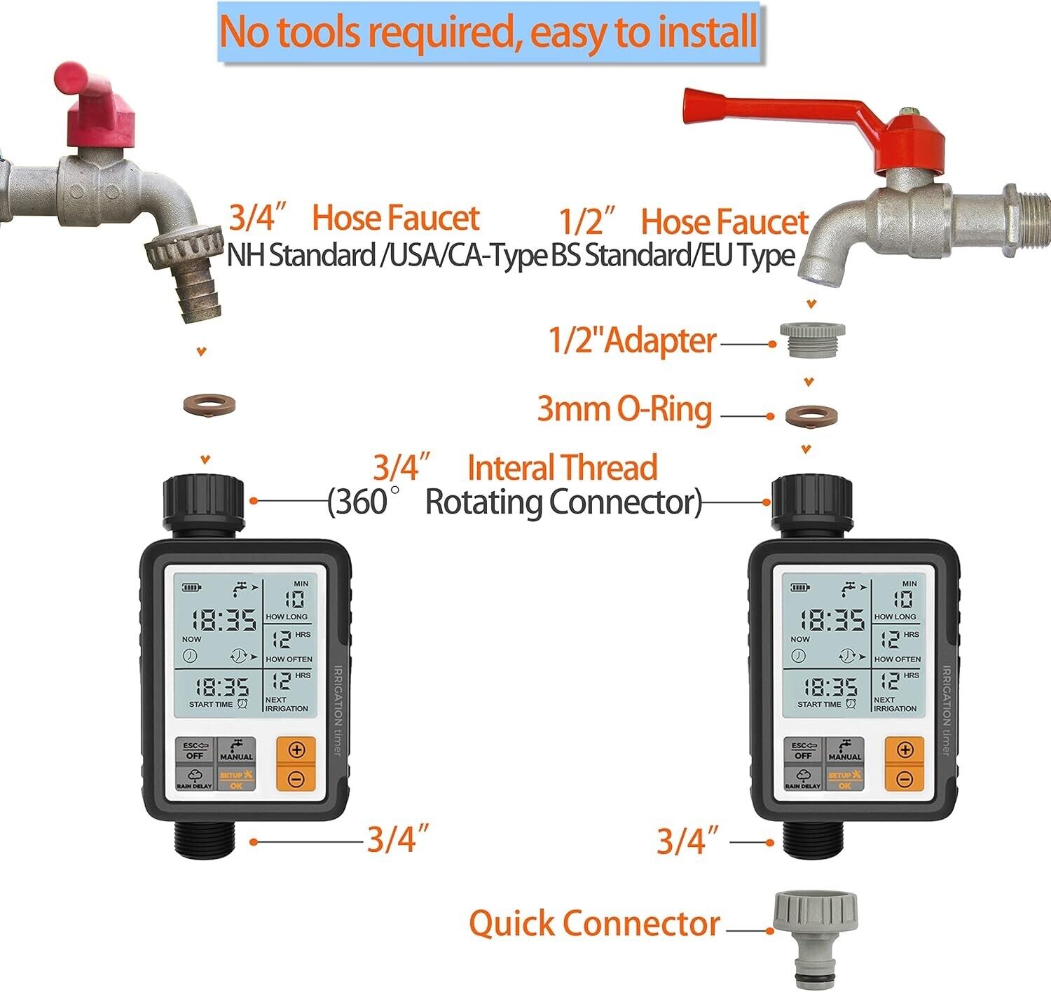 - Einfache und flexible Planung: CROSOFMI-Bewässerungstimer ermöglichen eine Vielzahl von Laufzeiten und Intervallen. Die kontinuierliche Bewässerungszeit beträgt 1 Sekunde bis 300 Minuten, und das Bewässerungsintervall betrug 1 Stunde bis 15 Tage. Dadurch wird Ihr Bewässerungsplan vollständig anpassbar. Das um 360° drehbare Kupplungsdesign erleichtert den direkten Anschluss an einen 1/2- oder 3/4-Wasserhahn ohne Werkzeug.