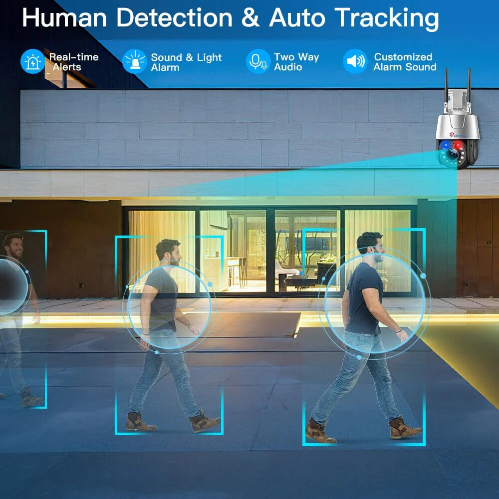 Diese überwachungskamera verfügt über eine Personenerkennungsfunktion und eine automatische Verfolgung und Fokussierung nach der Erkennung einer Person, wodurch 95% der Fehlalarme, die durch Regen, Wind, Insekten usw. verursacht werden, effektiv verhindert werden. Sie müssen keine Angst haben, dass sie ihr Ziel verliert. Wenn die CCTV-Kamera einen Eindringling erkennt, blinken die roten und blauen Lichter der Kamera abwechselnd, und der benutzerdefinierte Sprachalarm ertönt, um den Eindringling zu vertreiben.