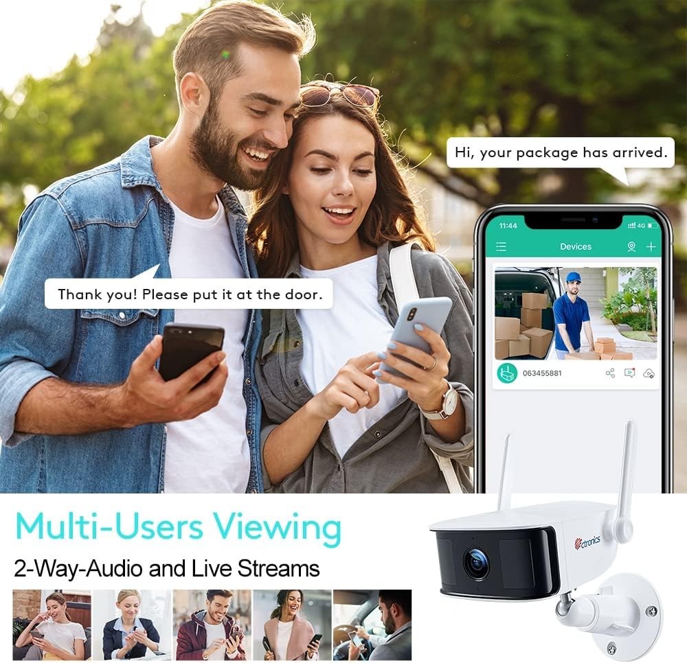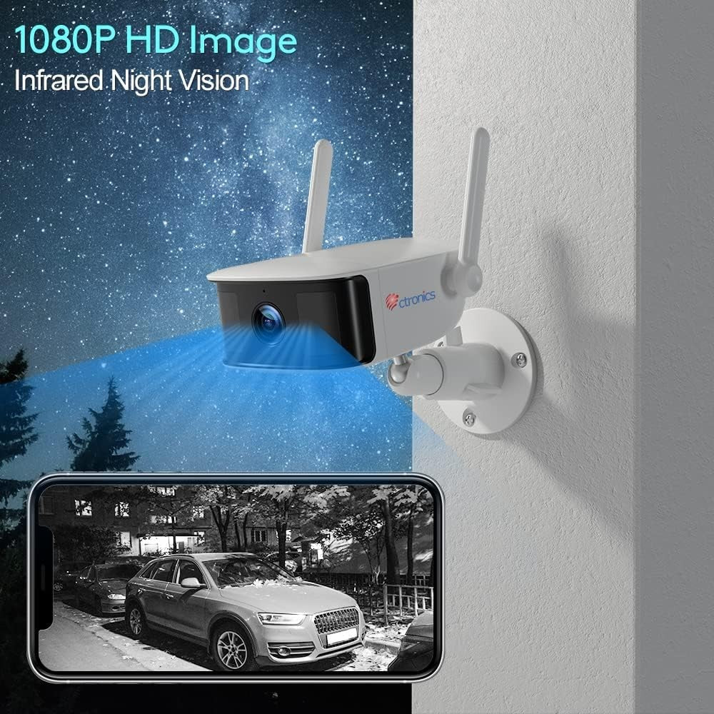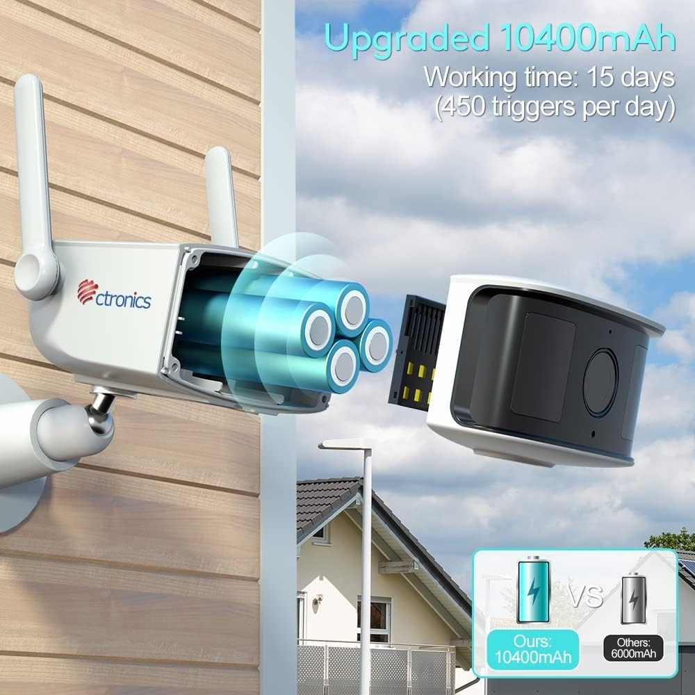 Ctronics Überwachungskamera, WLAN, für den Außenbereich, wiederaufladbar, 10400 mAh, Dual PIR, Detektoren, IP-Kamera, 100% kabellos, 1080P, HD, Audio, bidirektional, wasserdicht, IP66, SD-Kartenslot