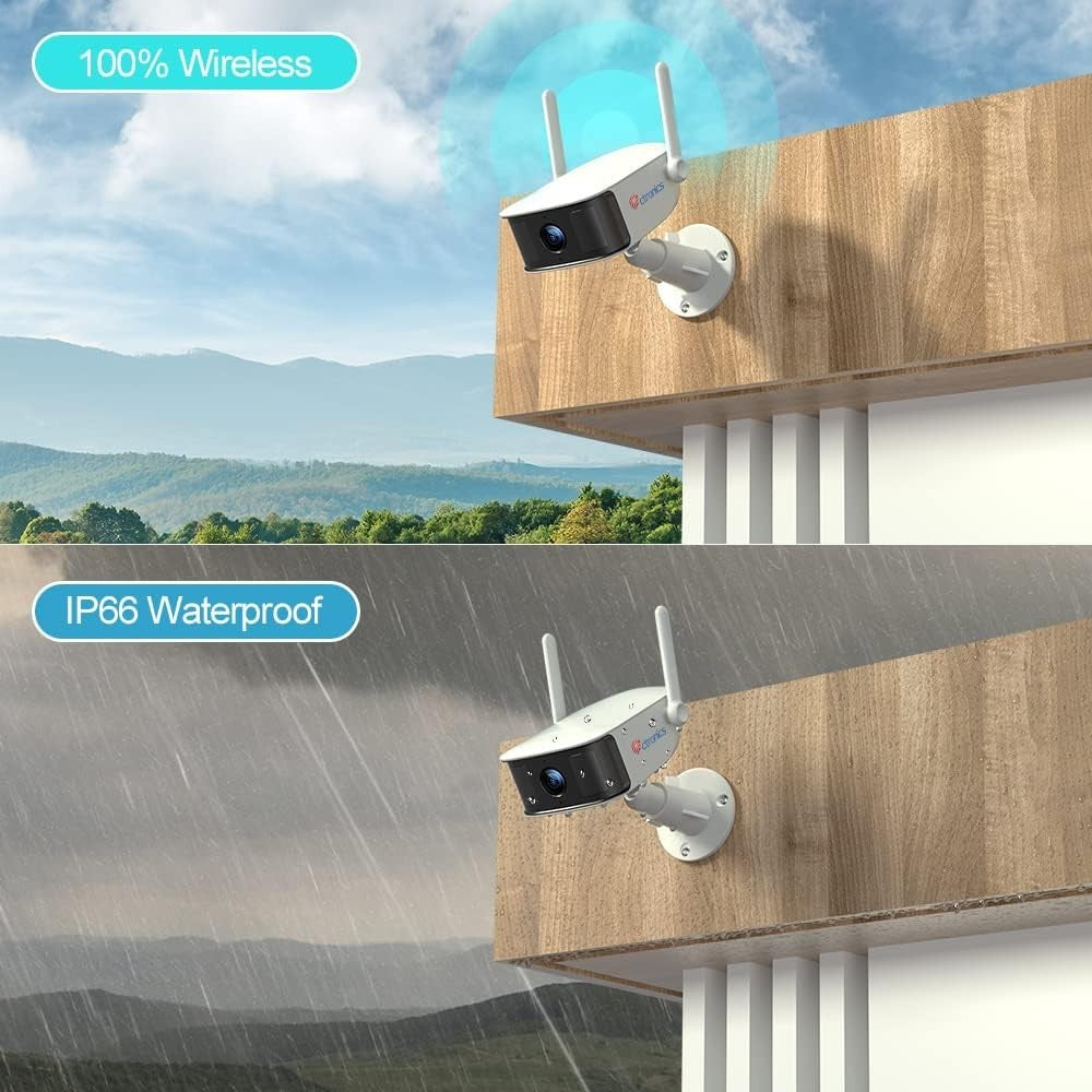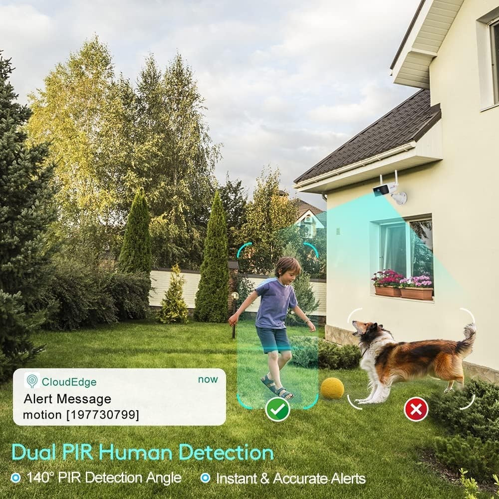- Dual PIR-Sensoren – Die Überwachungskamera mit Akku erkennt bewegliche Wärmequellen, im Gegensatz zu Kameras, die PIR von 90 ° und 8 m aufnehmen. Diese Überwachungskamera verfügt über zwei PIR-Sensoren für eine Entfernung von bis zu 12,8 m und eine Sicht von bis zu 140 °, das Erfassungsfeld der Überwachungskamera ist weiter als die mit einem einzigen PIR-Detektor. Die Kamera kann menschliche Erkennung verhindern, dass 90 % falsche Alarme durch Wind, Blätter usw. auftreten.