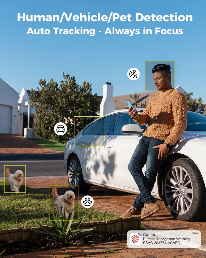 Die Kamera liefert ein superklares 4k 8mp (3840x2160) Bild,sehen Sie Objekte in der Ferne ganz einfach. Es kann Personen und Fahrzeuge und Tiere identifizieren, wenn es durch Bewegung aktiviert wird, das Ziel automatisch verfolgen und Benachrichtigungen in Echtzeit senden.