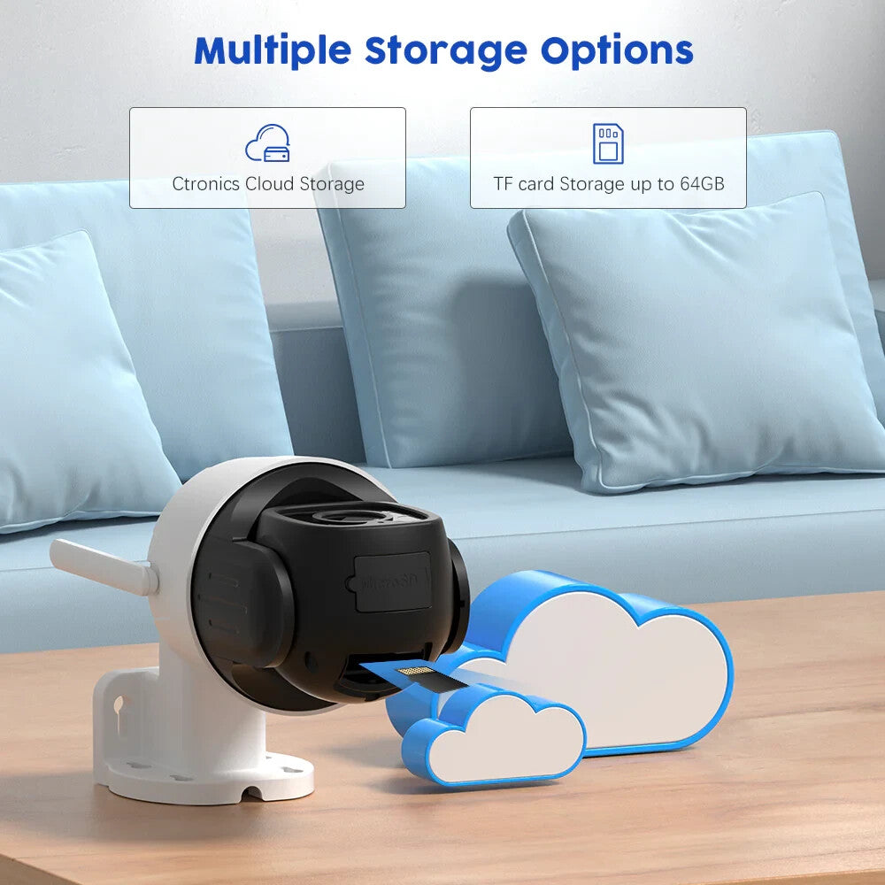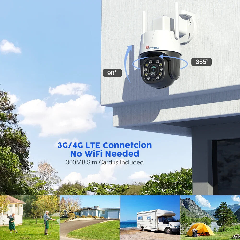 - 355° Schwenken, 90° Neigen, Cloud-/lokaler TF-Kartenspeicher. Diese 4G-Außenkamera mit SIM lässt sich um 355° horizontal und 90° vertikal drehen und unterstützt 4-fachen Digitalzoom, wodurch mehr Bereiche abgedeckt werden. Diese 4G-CCTV-Kamera mit SIM-Karte funktioniert mit der „ctronics pro“-App, die auf iOS-/Android-Systemen verfügbar ist und sowohl Cloud-Speicher als auch maximal 64 GB TF-Kartenspeicher unterstützt (TF-Karte ist nicht im Lieferumfang enthalten).
