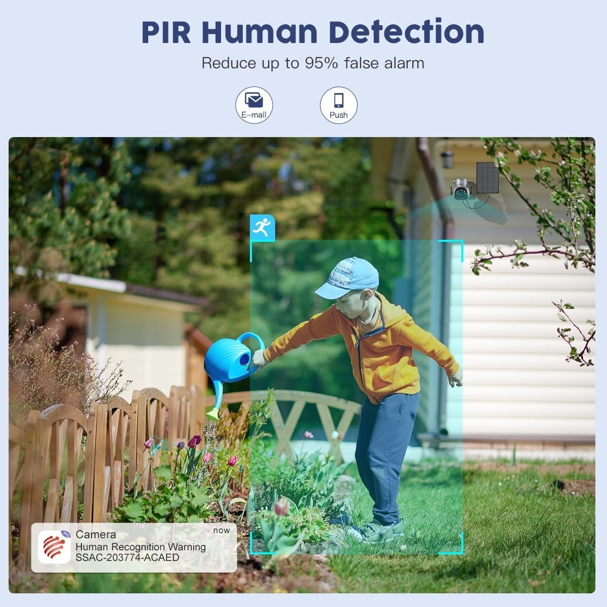 Diese solarbetriebene, kabellose Außenkamera ist standardmäßig im Energiesparmodus. Sobald sie Temperatur oder Bewegung erkennt, aktiviert sich ihr PIR-Sensor innerhalb von nur 0,2 Sekunden. Neben der Personenerkennung reduziert sie Fehlalarme um bis zu 95 %. Ihre Überwachungsreichweite beträgt bis zu 12 m. Dank dieser solarbetriebenen Kamera bleiben Sie stets informiert.