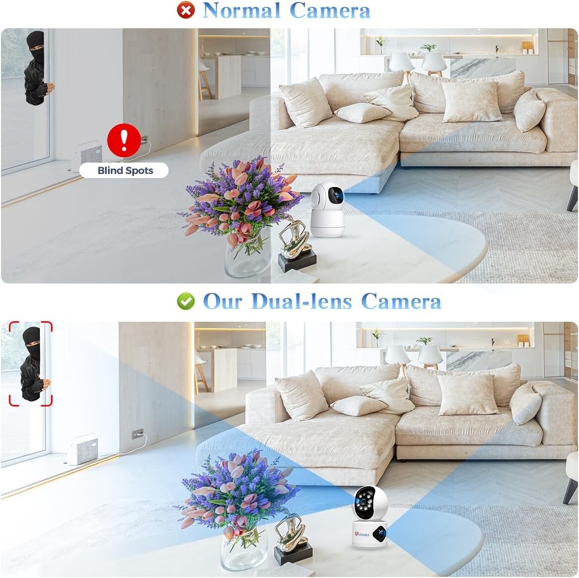- 【Duales Objektiv & Dualer Bildschirm】 Die Überwachungskamera für den Innenbereich verfügt über ein Dual-Linsen-Design für umfassende Abdeckung, keine toten Winkel und problemlose 4-fach digitale Zoomansicht. Die obere Kuppelkamera kann horizontal um 355° und vertikal um 90° gedreht werden. Die untere Kugelkamera ist an einer Stelle befestigt, um eine Weitwinkelverteidigung zu ermöglichen. So können Sie mit einer Kamera indoor den gleichen oder zwei verschiedene Bereiche gleichzeitig betrachten.