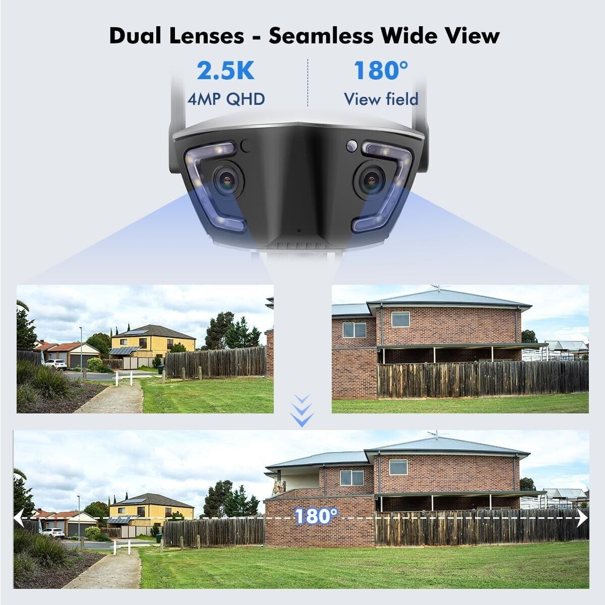 - 4MP QHD BILDER MIT 180° BETRACHTUNGSWINKEL: Durch die Kombination von zwei Objektiven bietet diese überwachungskamera Aussen Wlan einen 180° Panoramablick und erfasst viel feinere Details mit weniger Verzerrungen in 4MP Auflösung. Die einzigartige Bild-in-Bild-Schnittstelle in der App macht es einfach, den gewünschten Überwachungsbereich schnell einzusehen.