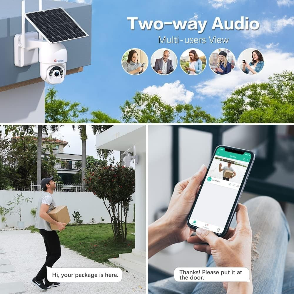 Mit dem integrierten Mikrofon und dem Lautsprecher der Ctronics 2K Solaren WLAN Überwachungskamera können Sie von überall aus mit Personen in der Nähe der Kamera reden und sie auch hören. Sie können diese Gegensprechanlage per Lautsprecher auch verwenden, um verdächtige Fremde zu warnen oder um mit Familie und Freunden zu reden, wenn Sie nicht zu Hause sind.