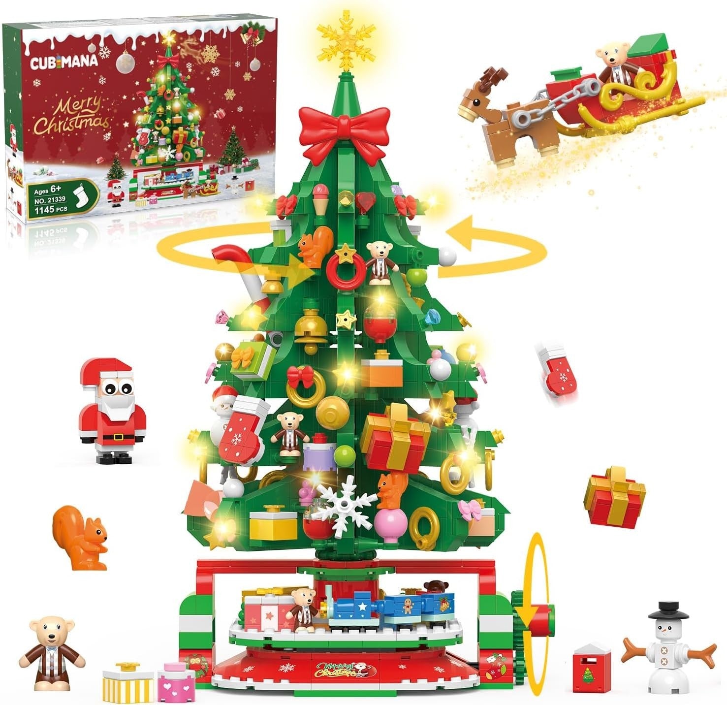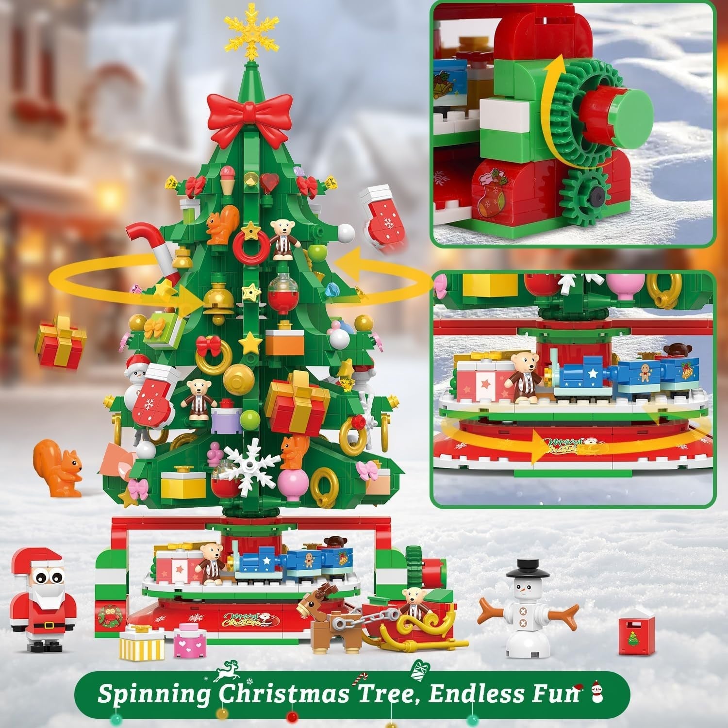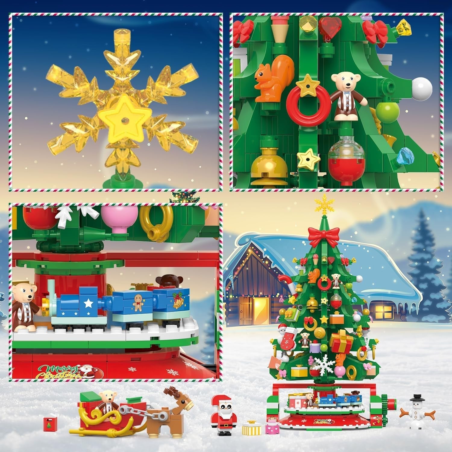 Drehbarer Weihnachtsbaum: Weihnachten ist eine Zeit der Freude, und wir haben unser Weihnachtsbauset mit interaktivem Gameplay erweitert, um den Feiertagsspaß zu steigern. Der Weihnachtsbaum kann sich drehen, um seine Schönheit in alle Richtungen zu zeigen, indem man den Griff dreht, und an der Basis befinden sich kleine Züge, die um den Baum herumfahren und Ihren Feiertagsfeierlichkeiten eine spielerische Note verleihen. Kinder werden stundenlang verzaubert und unterhalten sein