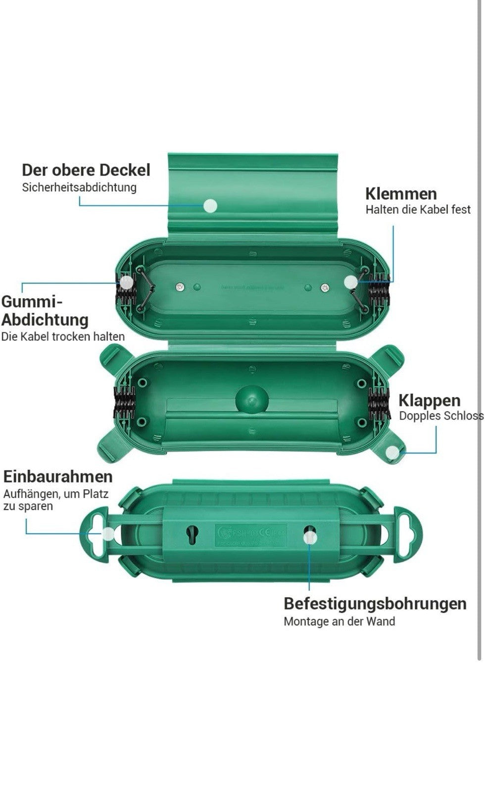 【Einfache Verwendung】 Keine Werkzeuge oder Installation erforderlich; Gummidichtungen an beiden Enden passen sich gut an das Stromkabel an; 2 Klemmen halten die Kabel fest aufhängbar und raumsparend; Verriegelung des oberen Deckels und 4 Verschlüsse zur Abdichtung, wetterbeständiges Material mit langer Lebensdauer