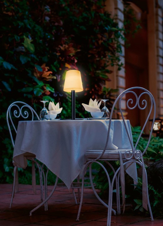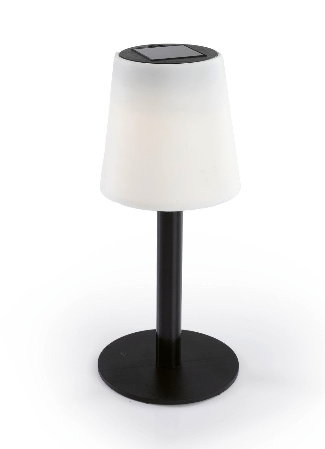 Das Solarpanel speist am Tage den Akku mit Sonnenenergie, um dann bei Eintritt der Dämmerung die modern gestaltete Leuchte erstrahlen zu lassen. Kabellos, wetterbeständig und somit fast überall einsetzbar - innen und außen! Aus Kunststoff. Maße: Ø-Lampenschirm: 12cm, Gesamthöhe: 28cm.
