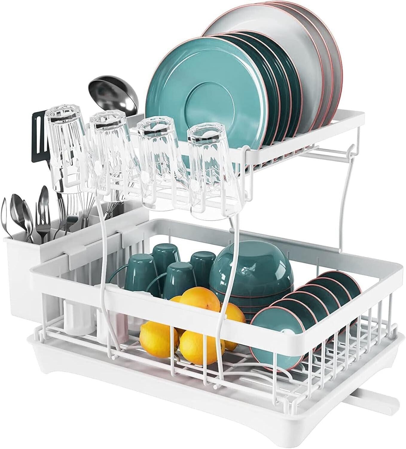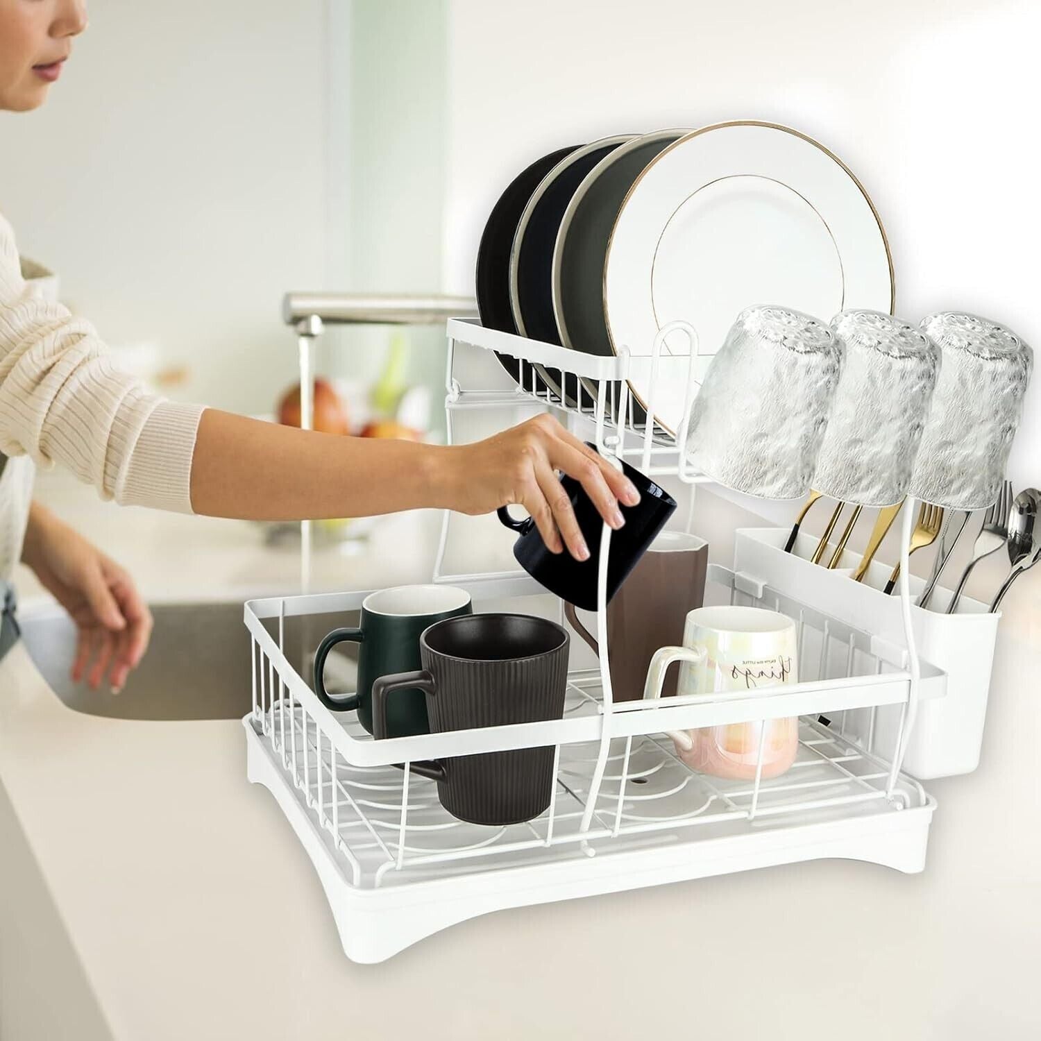 Edelstahl-Abtropfgestell mit 2-Ebenen, Geschirr-Trockenständer Weiß für Küchentheke