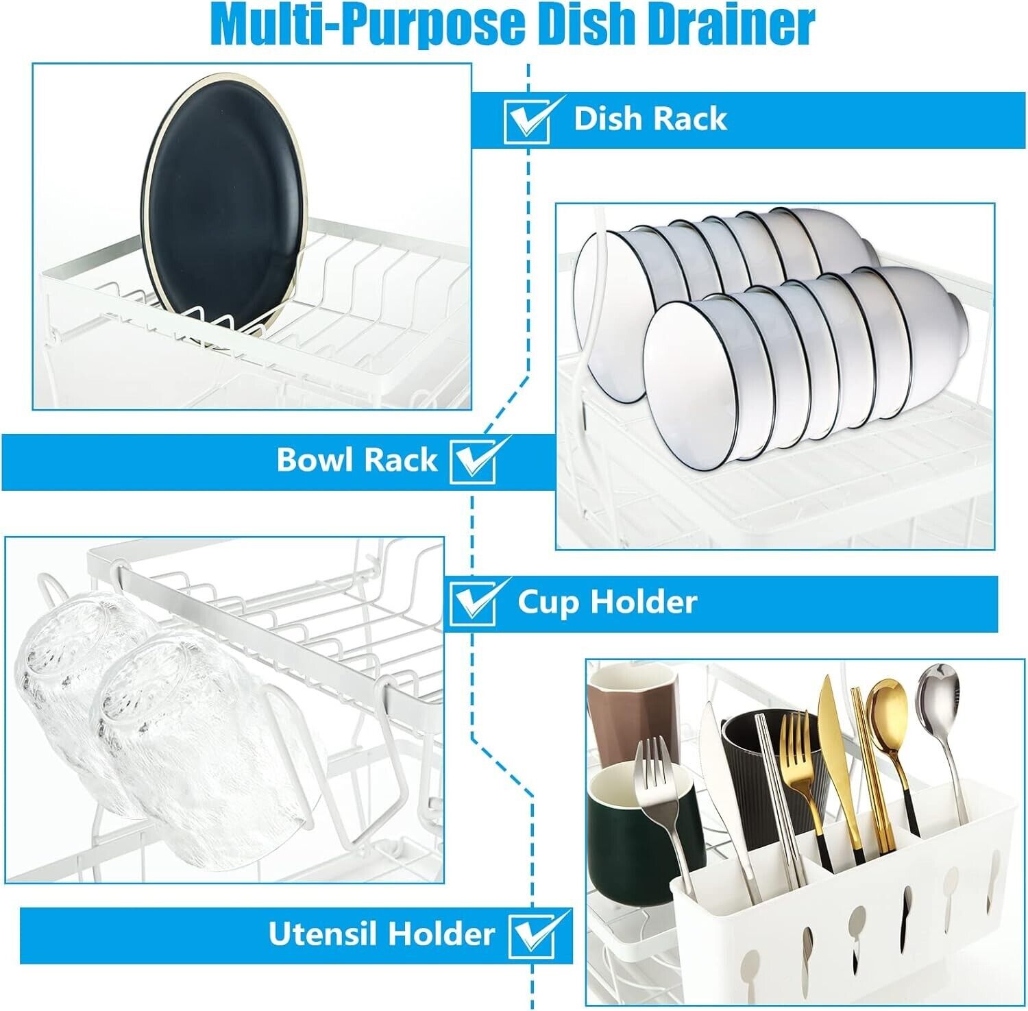 - 【Große Kapazität】Der Geschirr-Trockenständer Weiß ist mit abnehmbaren Teilen ausgestattet, darunter ein Besteckhalter und ein Tassenhalter, und Sie können ihre Positionen ändern, wenn Sie wollen. Der Edelstahl-Geschirrständer mit Utensilienhalter kann Teller, Schüsseln, Schalen, Pfannen, Tassen, Becher, Besteck, Messer, etc. aufnehmen, um all Ihre Bedürfnisse für die Aufbewahrung in der Küche zu erfüllen.