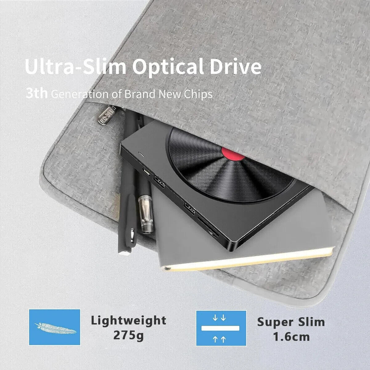 【Modisches und Tragbares Laufwerk】Das Vinyl-CD-förmige Erscheinungsbild lässt Ihr externes optisches Laufwerk stilvoller und modern aussehen. Das Datenkabel kann auf der Rückseite des optischen Laufwerks verstaut werden. Dank der Kompakte und Superschlank Produktgröße (15,5 x 14,5 x 1,6 cm, ca. 275g) ist das externe CD DVD Laufwerk leicht zu tragen. Sie können dieses externe CD & DVD Laufwerk in Ihrer Reisetasche oder auf Ihrem Schreibtisch aufbewahren. Perfekt für alle, die viel unterwegs sind oder den externen DVD- / CD-Player unterwegs nutzen möchten.