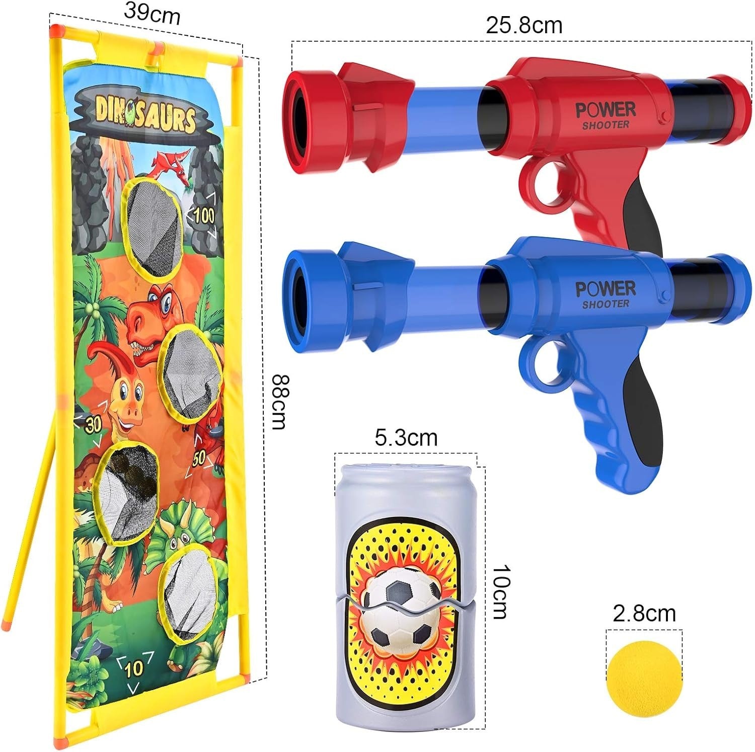 - chießspiele-Set: Stehende Zielscheibe mit 4 Zielscheiben; 2 Stück Luftleistung Popperpistolen; 24 Schaumstoffkugeln; 10 Stück Wurfdosen.