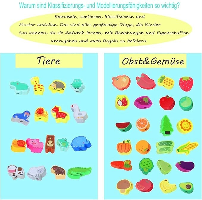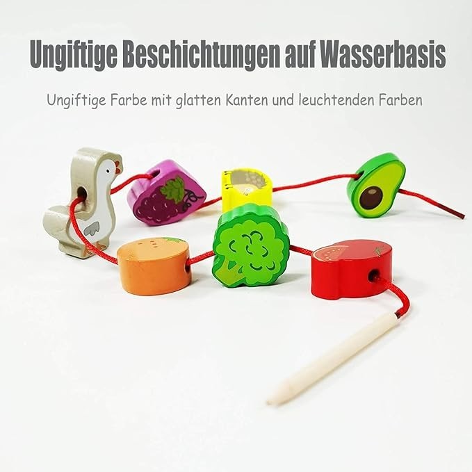 - 60 Stk. Fädelspiel Set: Dieses Holzperlenset besteht aus 60 Perlen und 5 Schnüren in leuchtenden Farben und schönen Mustern, darunter Tiere, Gemüse und Obst. Montessori-Kleinkindspielzeug ist ein Muss für Kinder, die neue Dinge lernen