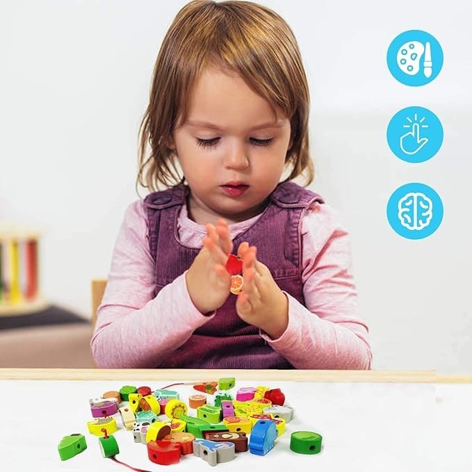 Gontence Fädelspiel, 60Stk. Holzperlen zum Auffädeln ,Motorikspielzeug