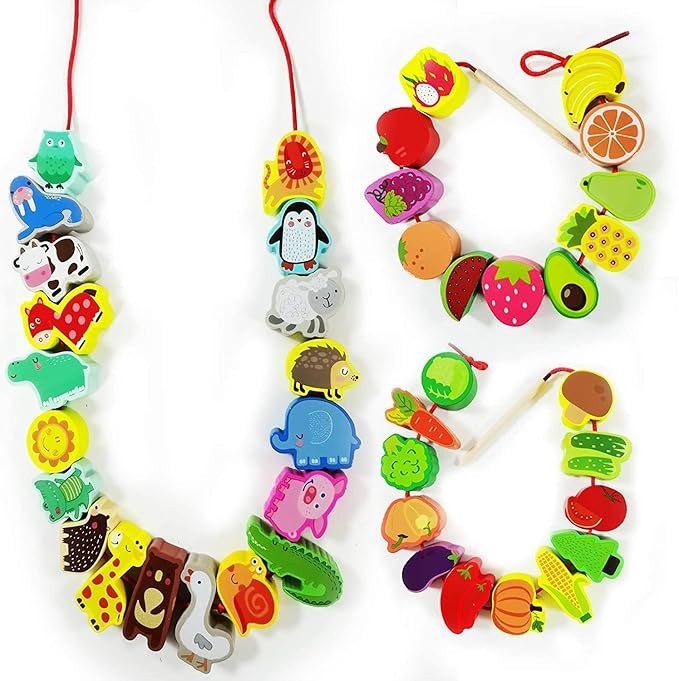 - Was du bekommst: Dieses Spielset enthält 60 Holzperlen und 5 Schnüre. 3 Form Tablets . Dieses Perlenkettenspielzeugset ist ideal für alle, die sich für Tiere, Obst, Gemüse und Fahrzeuge interessieren