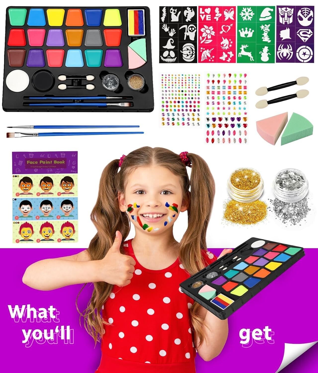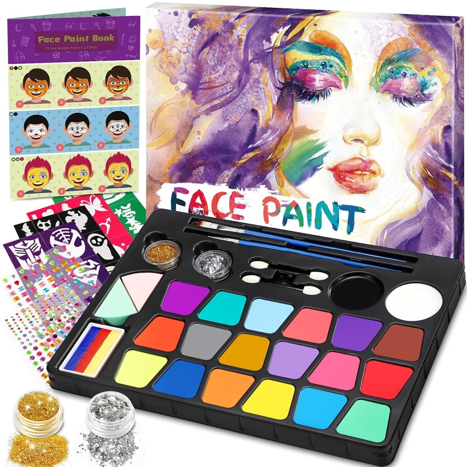 • Profi-Aqua Schminke: Das Gontence Kinderschminke Set enthält 20 Farben (einschließlich Schwarz und Weiß mit großer Kapazität), 258 Glitzersteine, 27 Schablonen, 2 Pinsel,