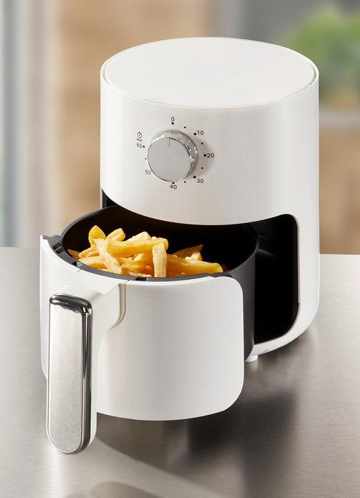 Energiesparende Heißluft-Fritteuse – ideal zum Frittieren, Grillen, Braten, Backen, Rösten, Auftauen, Erhitzen und Warmhalten. Fettarme Zubereitung – nahezu ohne Öl. Die clevere Kombination aus Heißluftofen und Grill benötigt 55% weniger Energie als ein handelsüblicher Backofen. (*Im Vergleich zu einem handelsüblichen Backofen in Bezug auf die Aufnahmekapazität der Heißluft-Fritteuse). Gleichmäßige Wärmeverteilung – außen kross und innen zart. Es entstehen weniger Gerüche. Einfache Bedienung: Eine Temperatureinstellung für alle Gerichte (200 °C). 60-Minuten Timer mit automatischer Abschaltung für punktgenaues Garen. Schublade herausnehmbar. 2 Liter Fassungsvermögen. Platzsparend und ideal für kleine Haushalte. Kompakte Maße: ca. ø 24xH25 cm. 800 Watt.