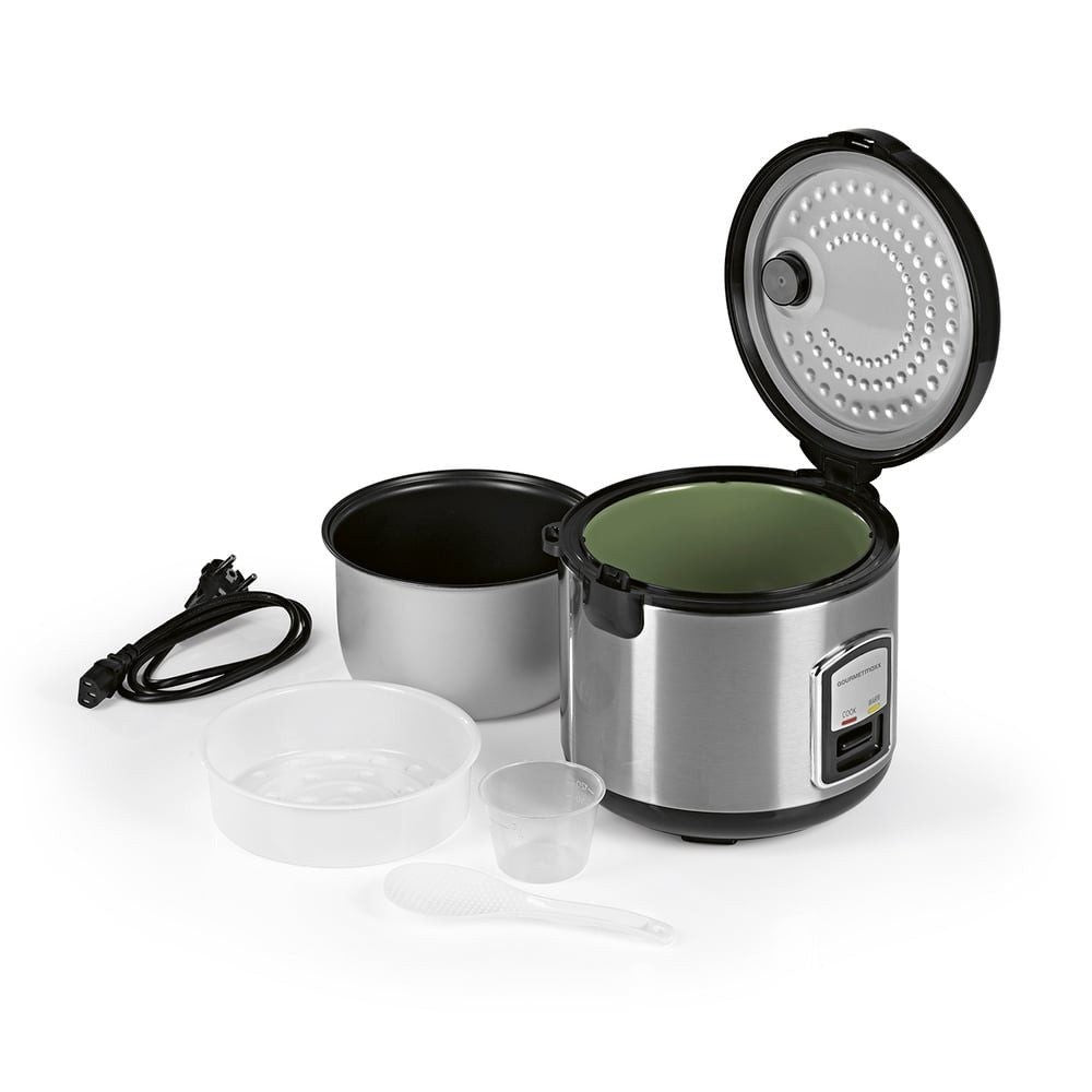 Doch auch Meeresfrüchte, Fleisch und Obst können Sie mit dem Kompakt-Reiskocher wunderbar zubereiten. Dank des umfangreichen Zubehörs erhalten Sie nicht nur den Reiskocher, sondern u. a. auch den passenden Dampfeinsatz, einen Gartopf, einen praktischen Reislöffel sowie einen Messbecher. Mit diesem können Sie die Reis- und Wassermengen perfekt portionieren und anschließend den Kochvorgang mit nur einem Knopfdruck starten.