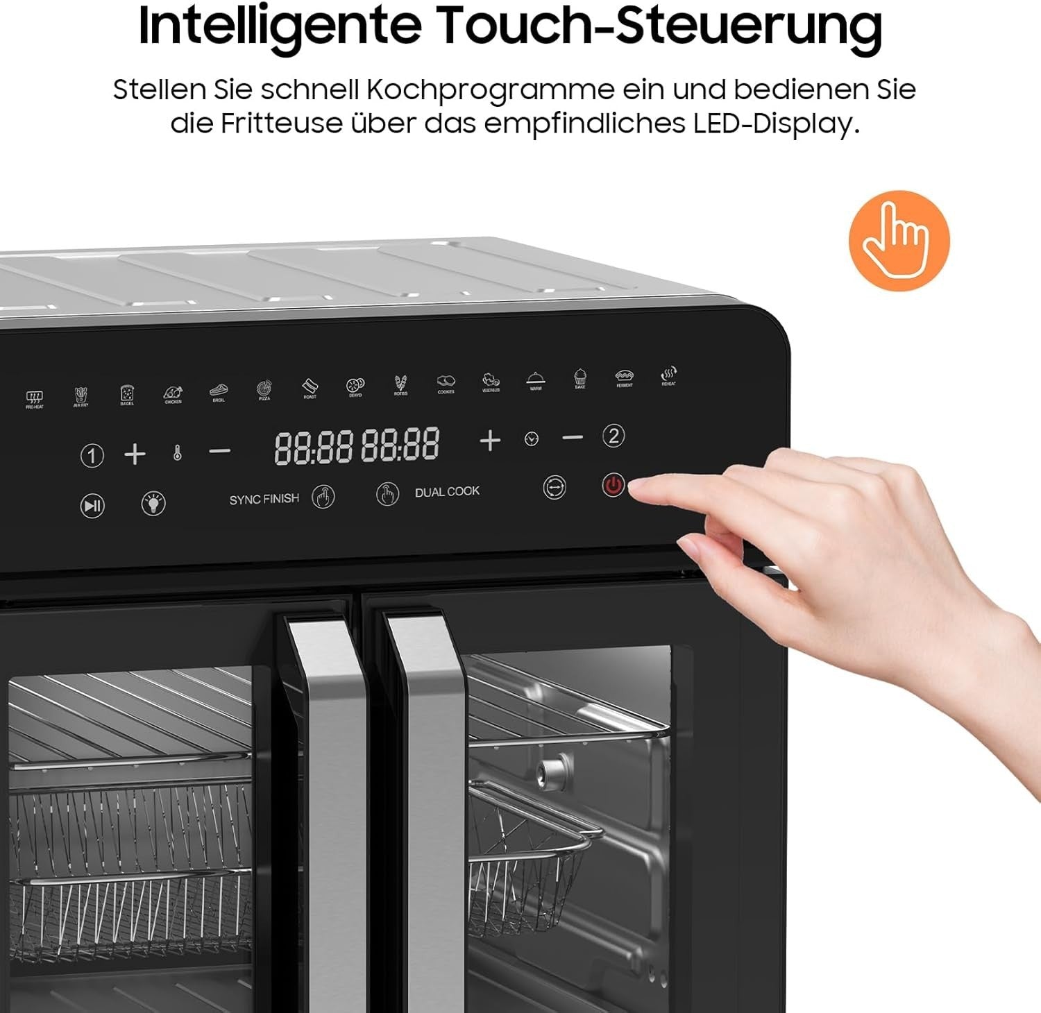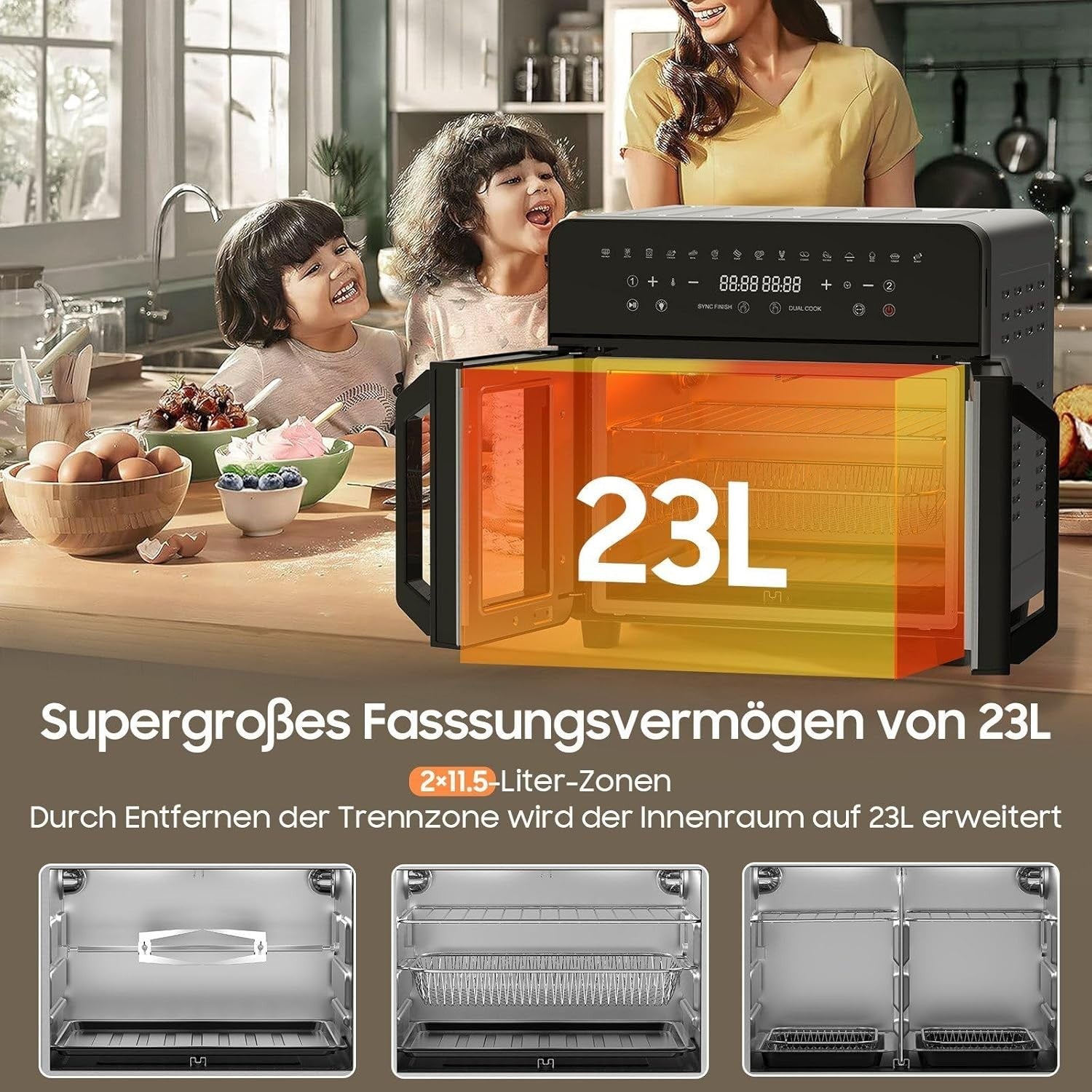 Heißluftfritteuse 23L Dual Zone - XXL Airfryer mit French Door | Heissluftfritteuse Ofen mit Doppelkammer, 15 Programme, 2200W, 12 Zubehör, Herausnehmbarem Trenner für Kochraum, 50-200℃