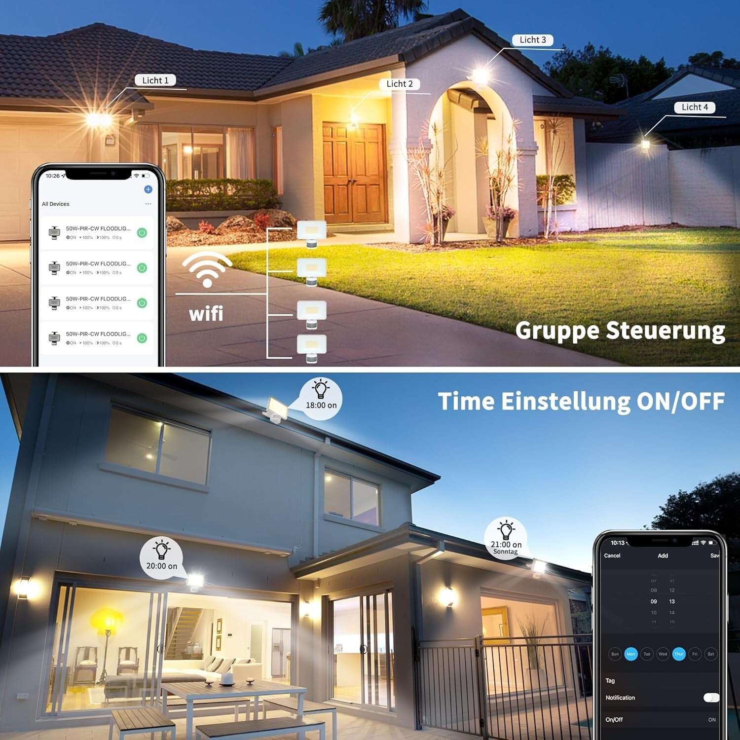 - 【Verbesserte App und Sprachgesteuerter Bewegungssensor】Led strahler mit bewegungsmelder außen mit app können sie intelligenten wifi (nur 2,4ghz wi-fi) fluter von überall mit ihrem telefon steuern, egal ob sie im büro arbeiten oder auf reisen sind. funktioniert auch mit amazon alexa und google assistant. erfassungsbereich erreicht maximal 80㎡. wenn der pir-sensor erkennt bewegung in einem bestimmten abstand, wird das licht automatisch für den gewünschten zeitraum einschalten und die reaktion ist schnell.