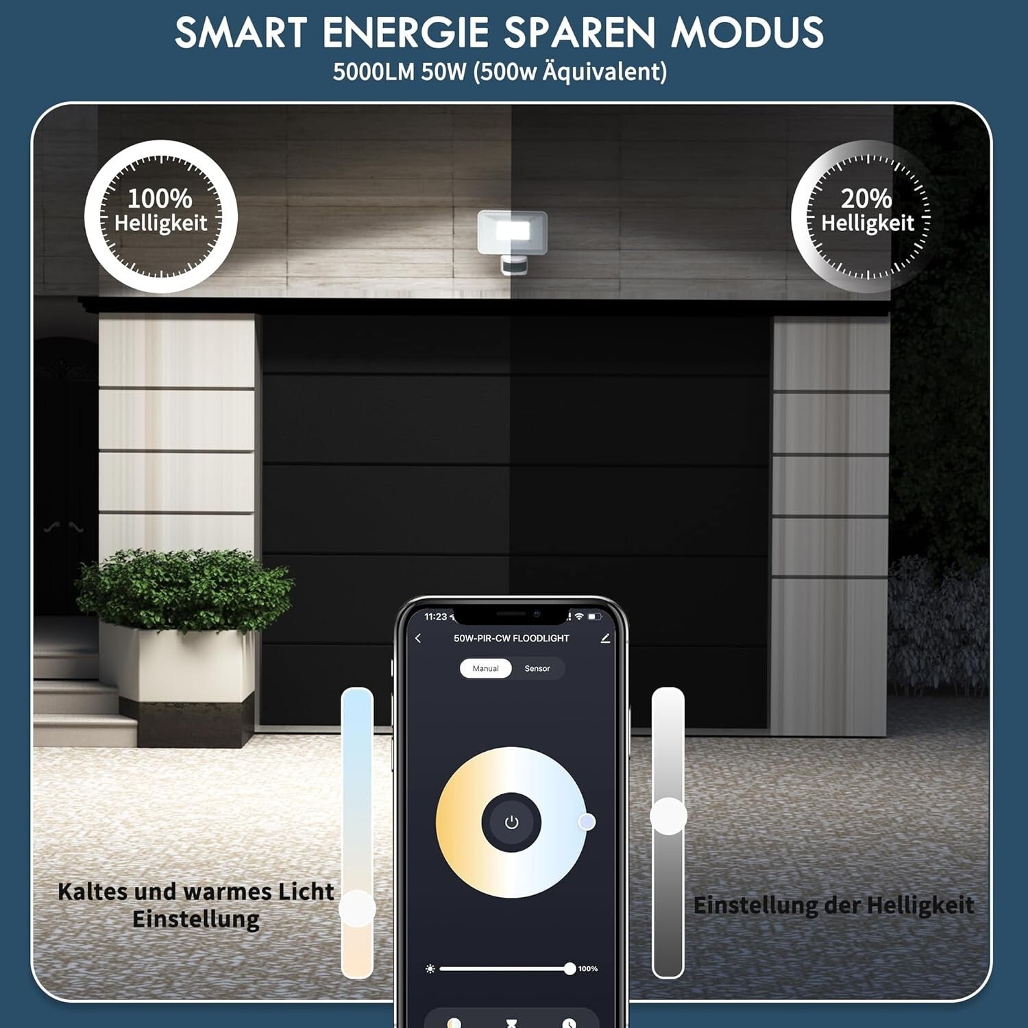 HELLYMOON 50W LED Strahler mit Bewegungsmelder Außen, 5000LM Led Strahler Außen, APP Steuerung 6500K Kaltweiß Scheinwerfer, IP65 Wasserdichte Led Fluter Außen für Garten, Hof, Garage, Haus, Fabrik [Energieklasse E]