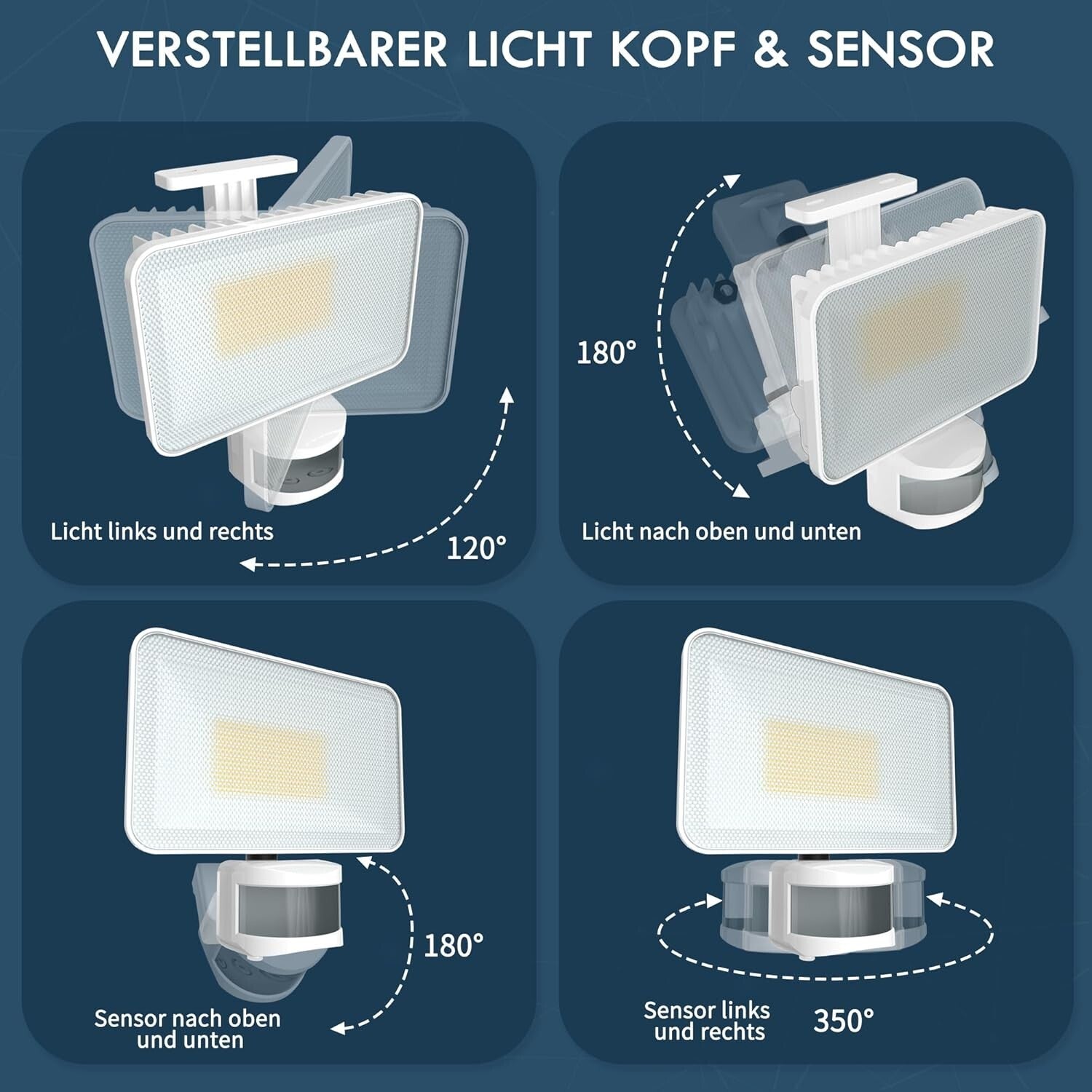 - 【Flexibel einstellbare led strahler mit bewegungsmelder außen】Strahler mit bewegungsmelder aussen kann durch die sich bewegenden menschen, autos oder tiere bis zu 59 fuß erfassungsbereich bei 180° erfassungswinkel ausgelöst werden. stellen sie die bewegungsflutlichtköpfe und den bewegungssensor einfach auf verschiedene winkel ein, basierend auf ihren anforderungen, bringt zusätzliche sicherheit für ihr zuhause. perfekt für verschiedene orte und winkel, die sie die flutlichter frei drehen helfen.