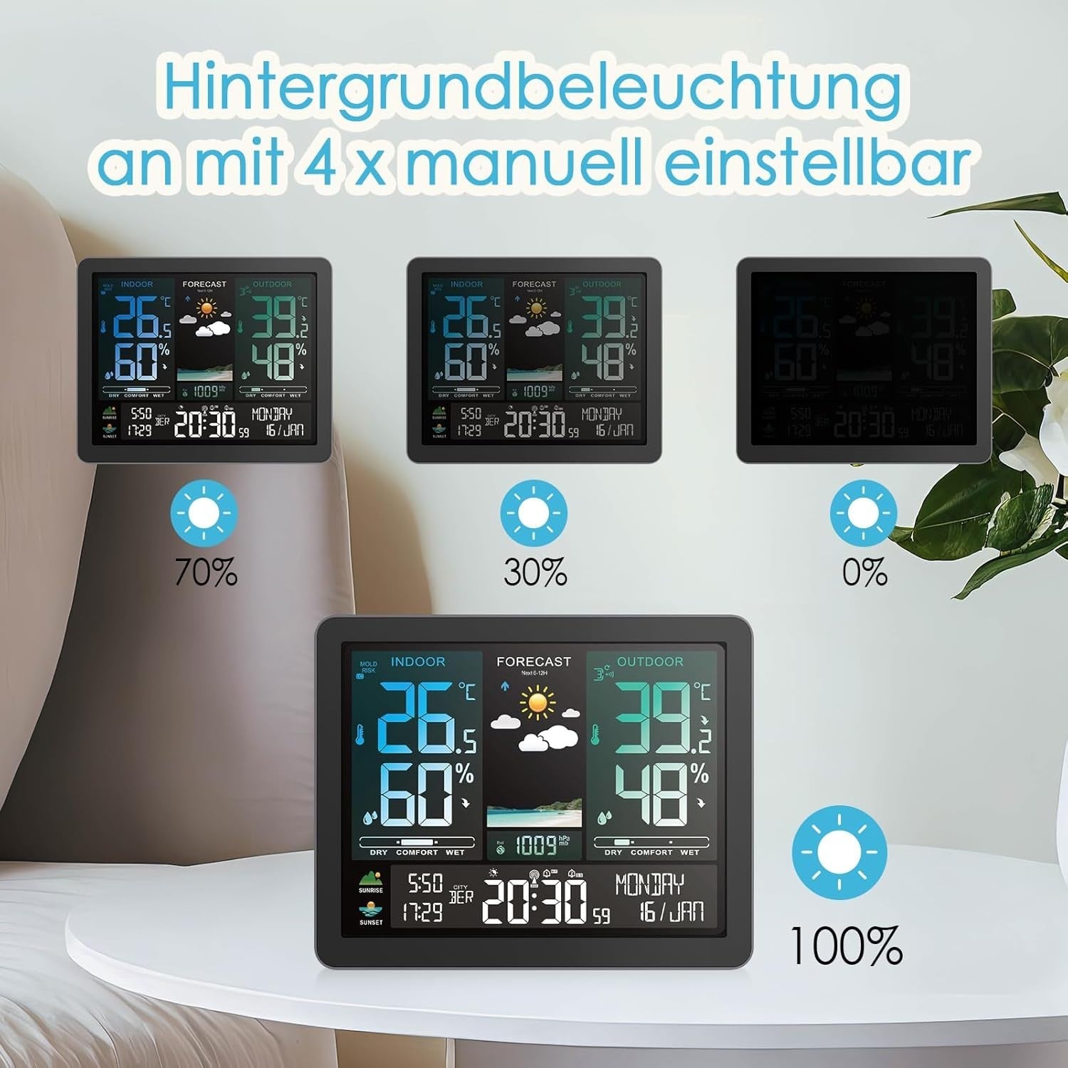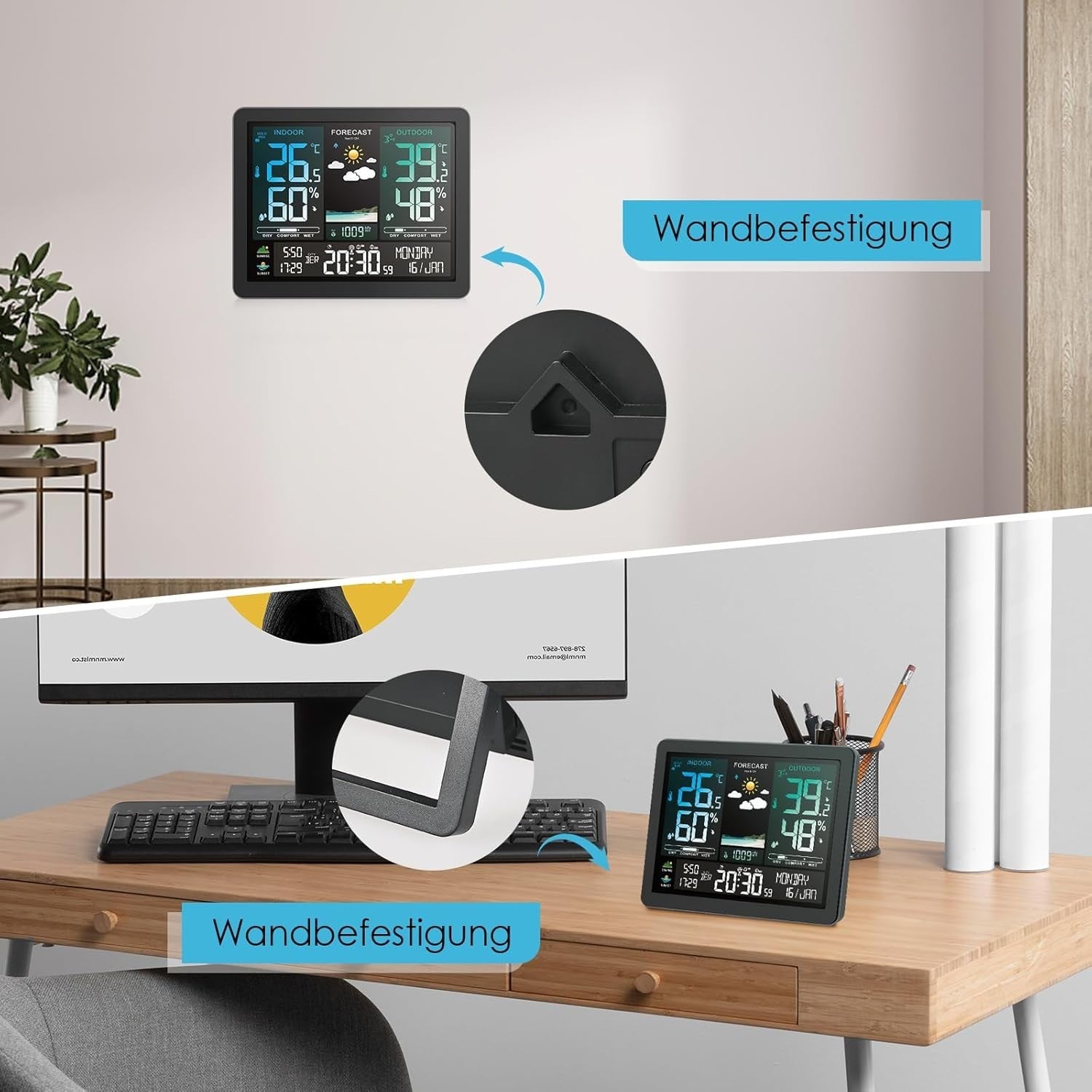 - [Großes, gut lesbares Display] Die Wetterstation ist mit einem großen, farblich abgestimmten und inhaltsreichen Display ausgestattet, auf dem die Informationen leicht abgelesen werden können. Mit großen Betrachtungswinkeln und automatischer Hintergrundbeleuchtung müssen Sie sich keine Sorgen machen, dass der Bildschirm zu hell oder zu dunkel ist, sodass Sie den Inhalt auf dem Display nicht sehen können.