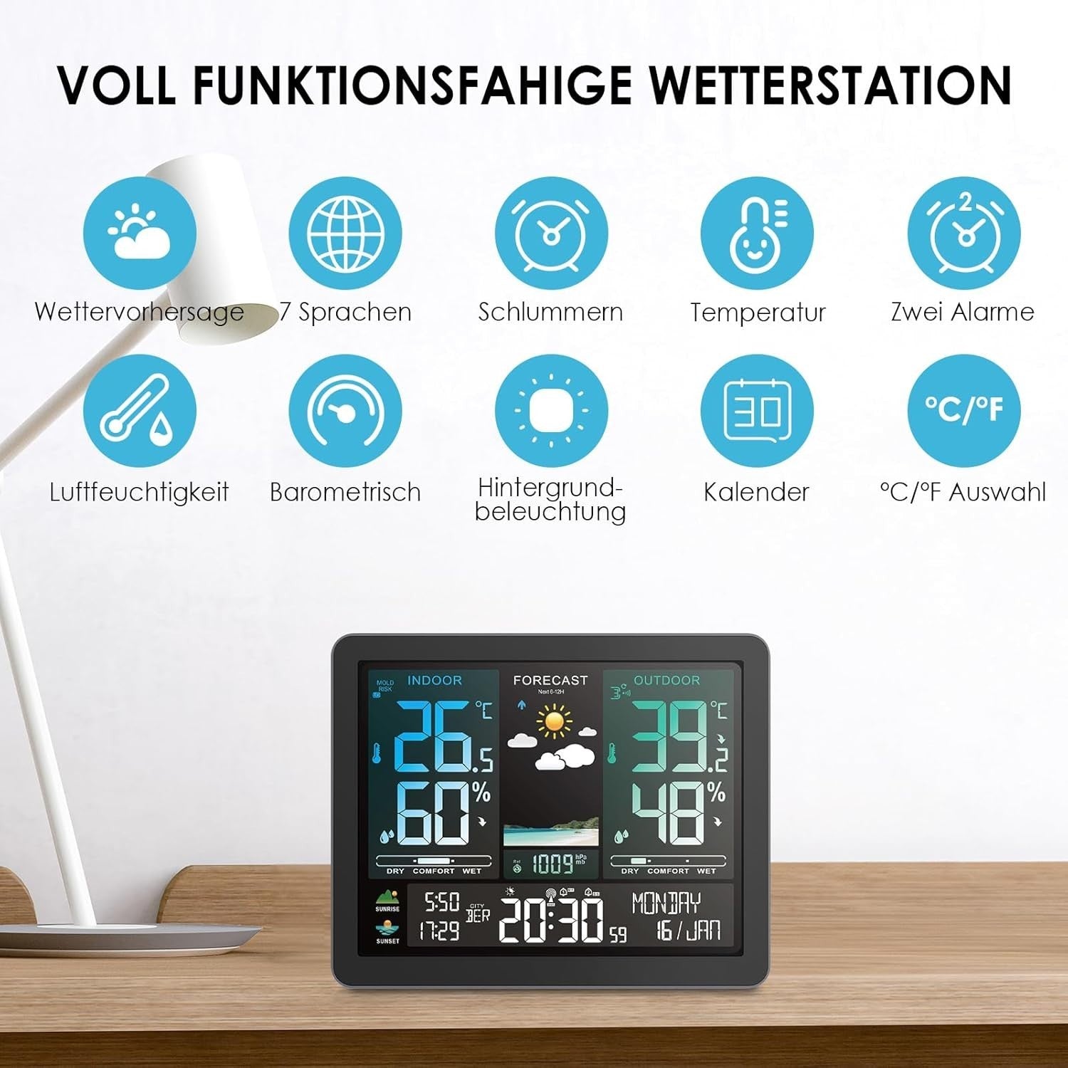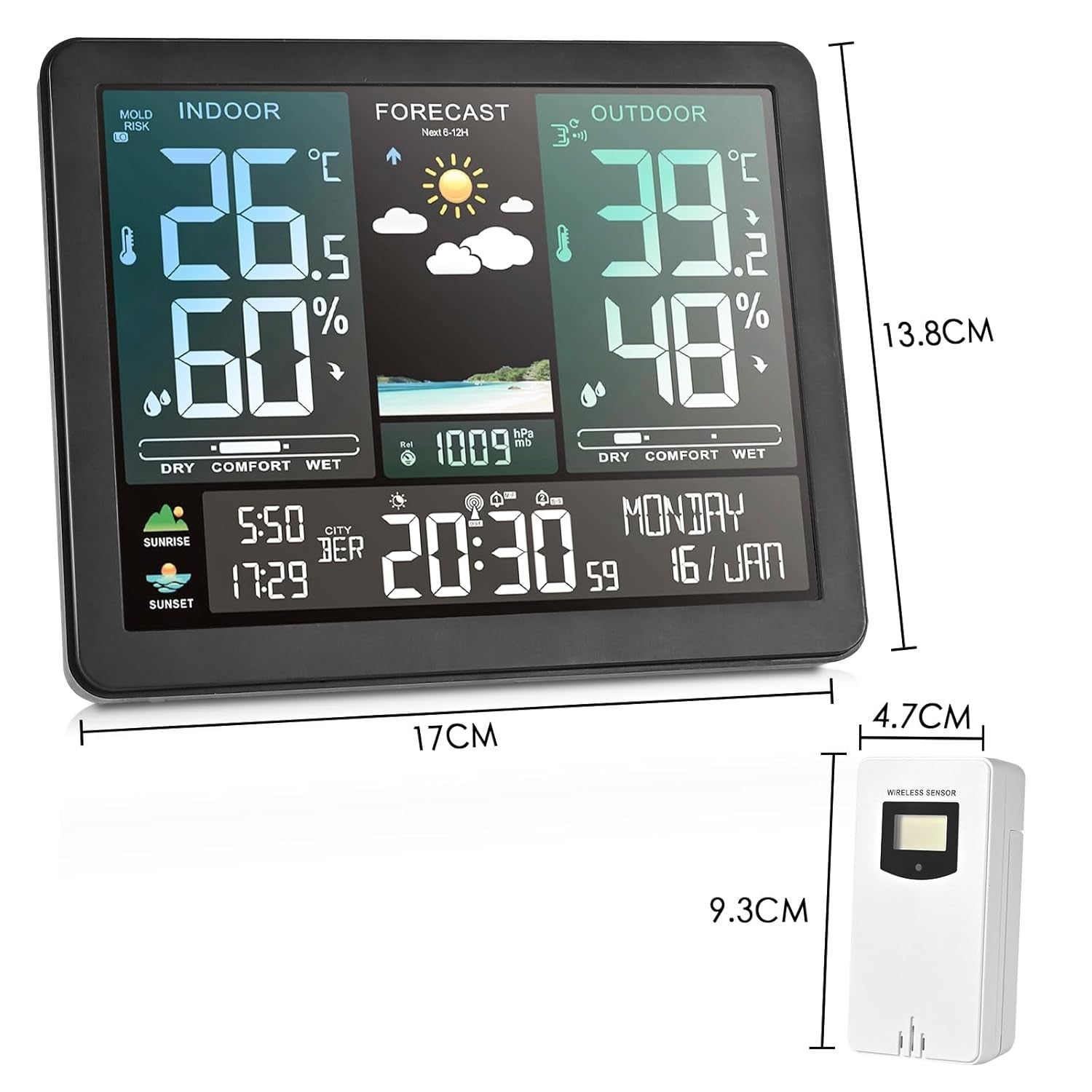 - [Multifunktionales Wetterthermometer] Die Wetterstation verfügt über eine Vielzahl von Funktionen zur Anzeige weiterer benötigter Informationen: dynamische Wettervorhersagen, Innen-/Außentemperatur und Luftfeuchtigkeit (Max./Min.) und Komfortanzeige, Zeit-/Datumsanzeige (12 Stunden/24 Stunden). Stunden), Sonnenaufgangs-/Sonnenuntergangszeitanzeige, Luftdruckindex, Wecker mit Schlummerfunktion und mehr.