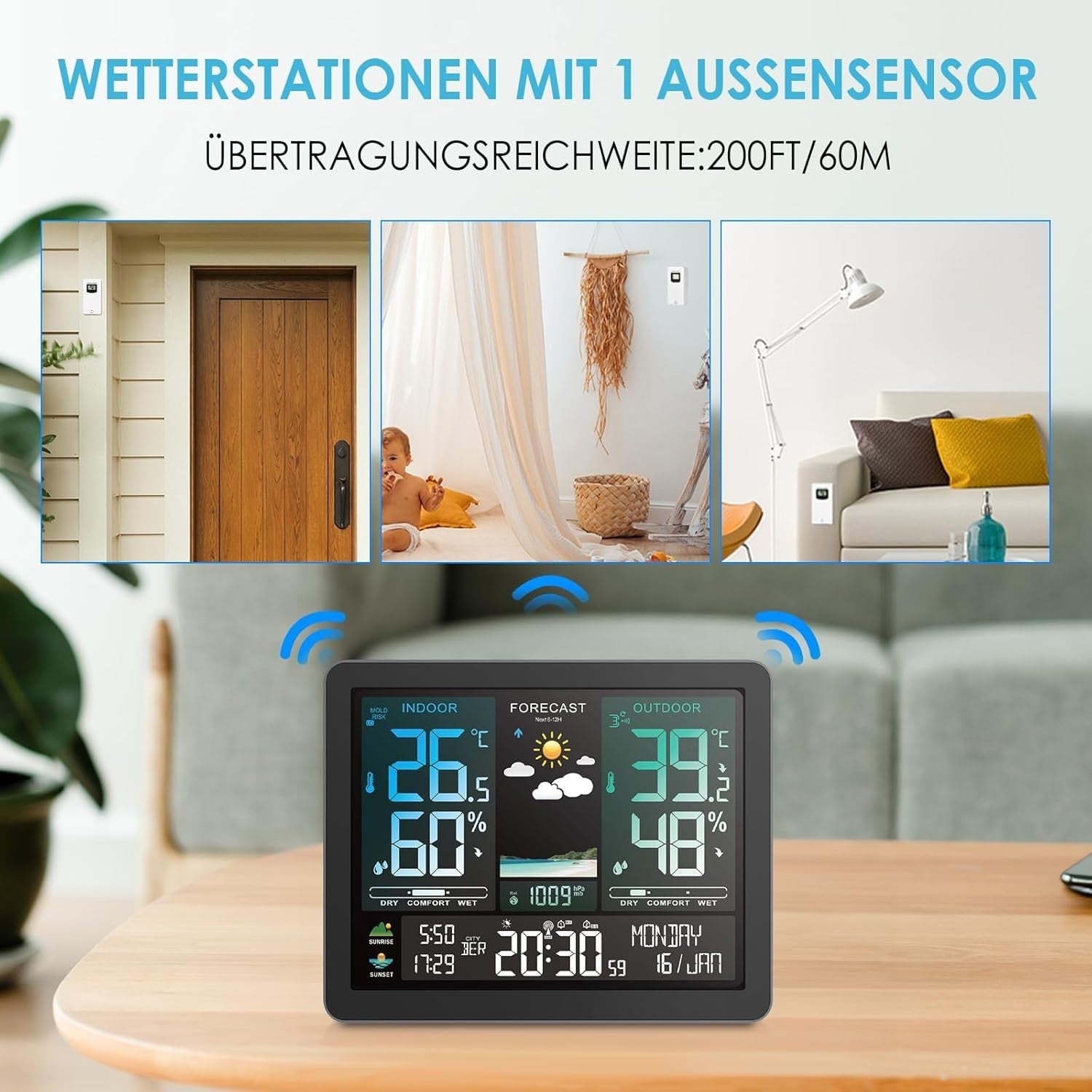 Herboom Wetterstation Funk mit Außensensor mit Wettervorhersage, mit 7,4 Zoll