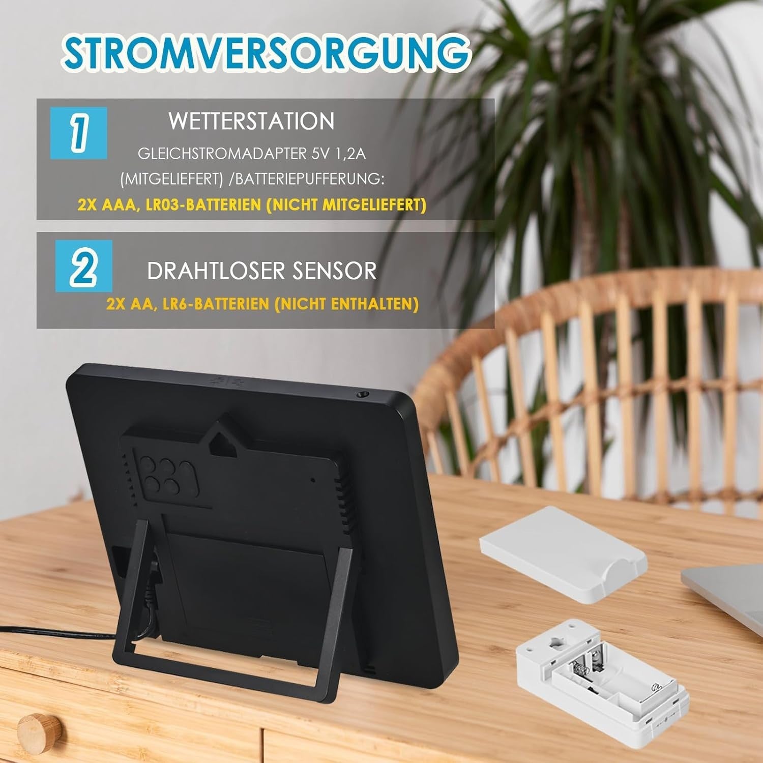 - [2 Stromversorgungsmodi] Die Wetteruhr kann auf zwei Arten mit Strom versorgt werden. Im Adaptermodus kann die Helligkeit des Bildschirms in 4 Stufen angepasst werden, oder Sie können den automatischen Dimmmodus aktivieren. Im Akkubetrieb leuchtet der Bildschirm auf, wenn Sie die Oberseite berühren, und schaltet sich nach 15 Sekunden automatisch aus, um Strom zu sparen. (Batterien nicht enthalten)