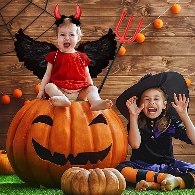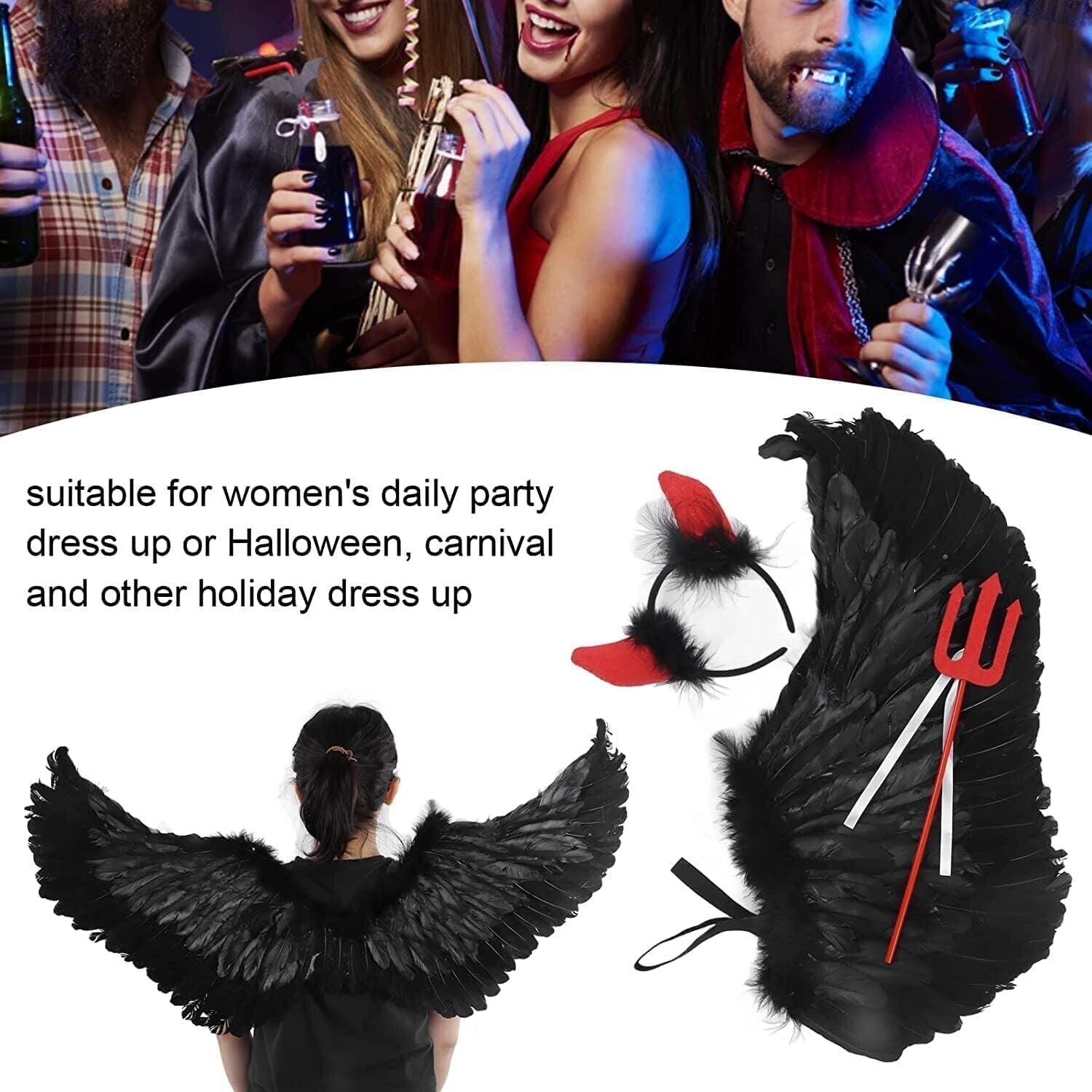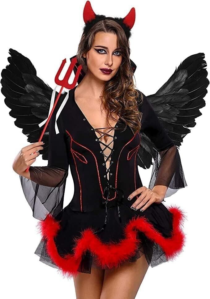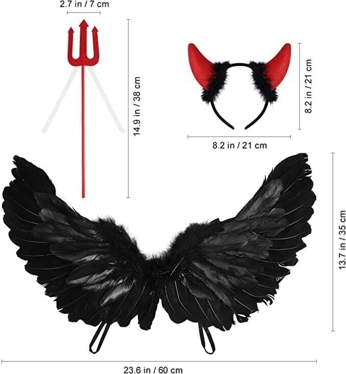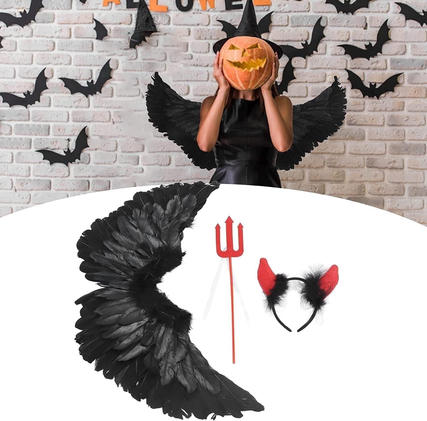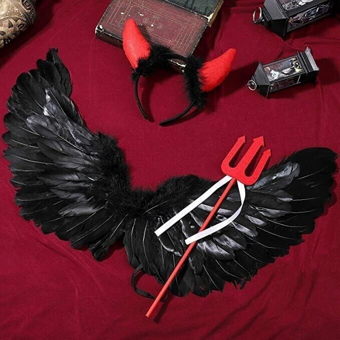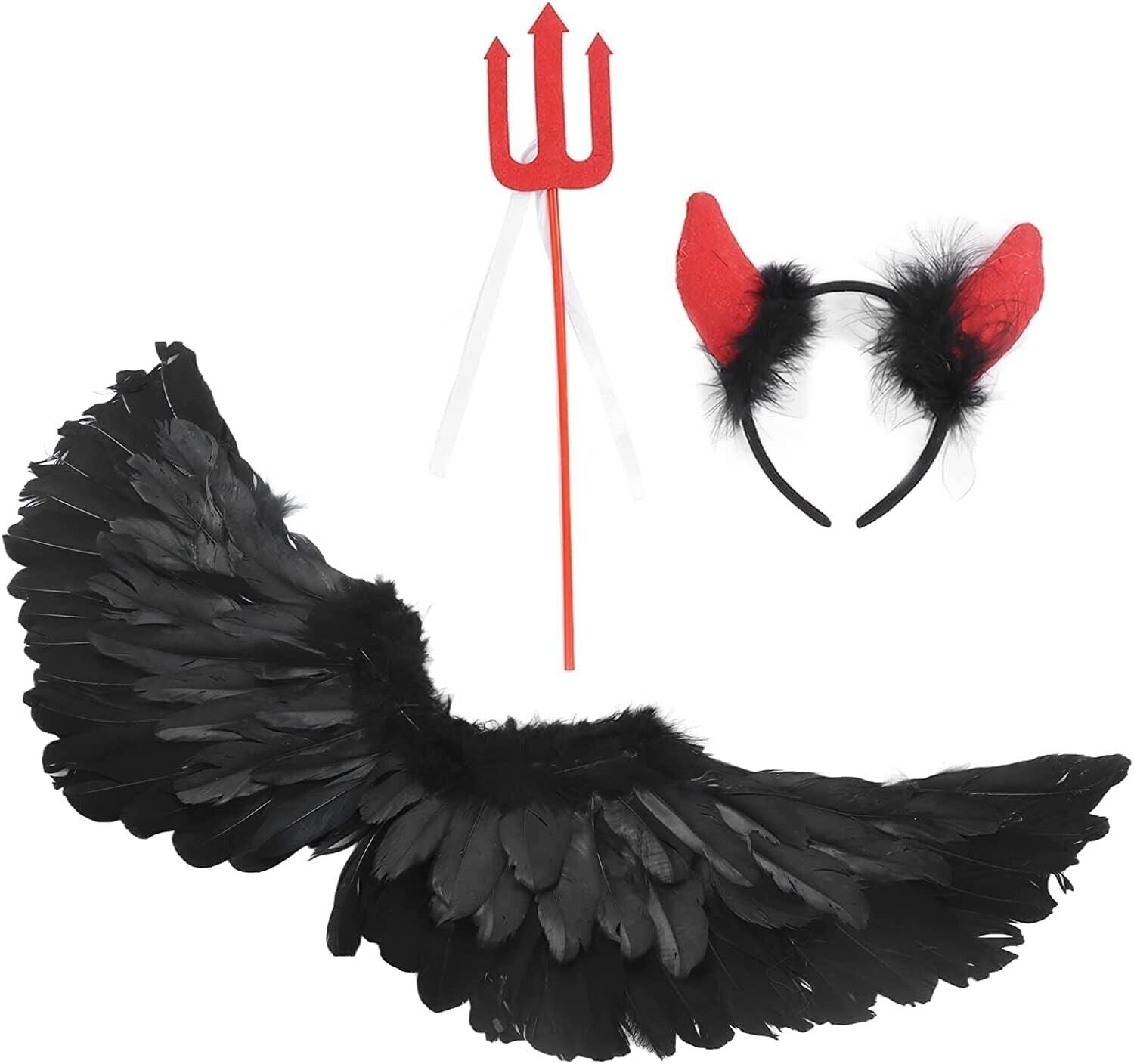 HIQE-FL Teufelchenflügel, Federflügel Engel, Schwarz Engelsflügel Deko mit Hörner und Dreizack, Schwarz Engel Kostüm Damen, Party Fasching Kostüme,Kostümparty Verkleidung